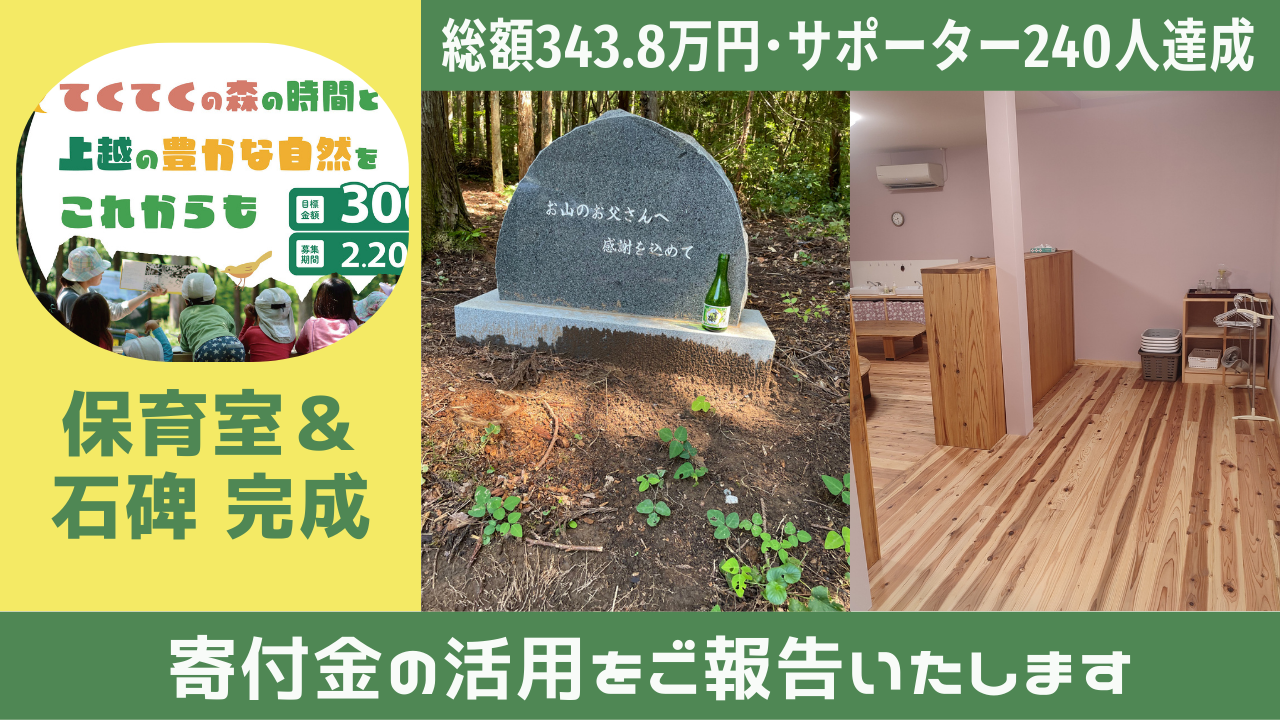 今後も一人でも多くの子どもたちに森の時間を、そして子どもたちと一緒に沢山の大人が森に関わり続けることで守られる山林や農地を残していきたいという想いを宣言して、みなさんにご支援をお願いすることとなりました。