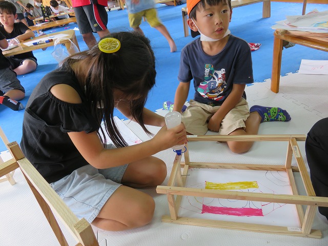 白い紙に好きなように好きなものを書いて貼り付けです。好きなものはみんなそれぞれですが、好きなものというより、『夏まつり』といえば!と考えて描く子どもたちが多かったです。