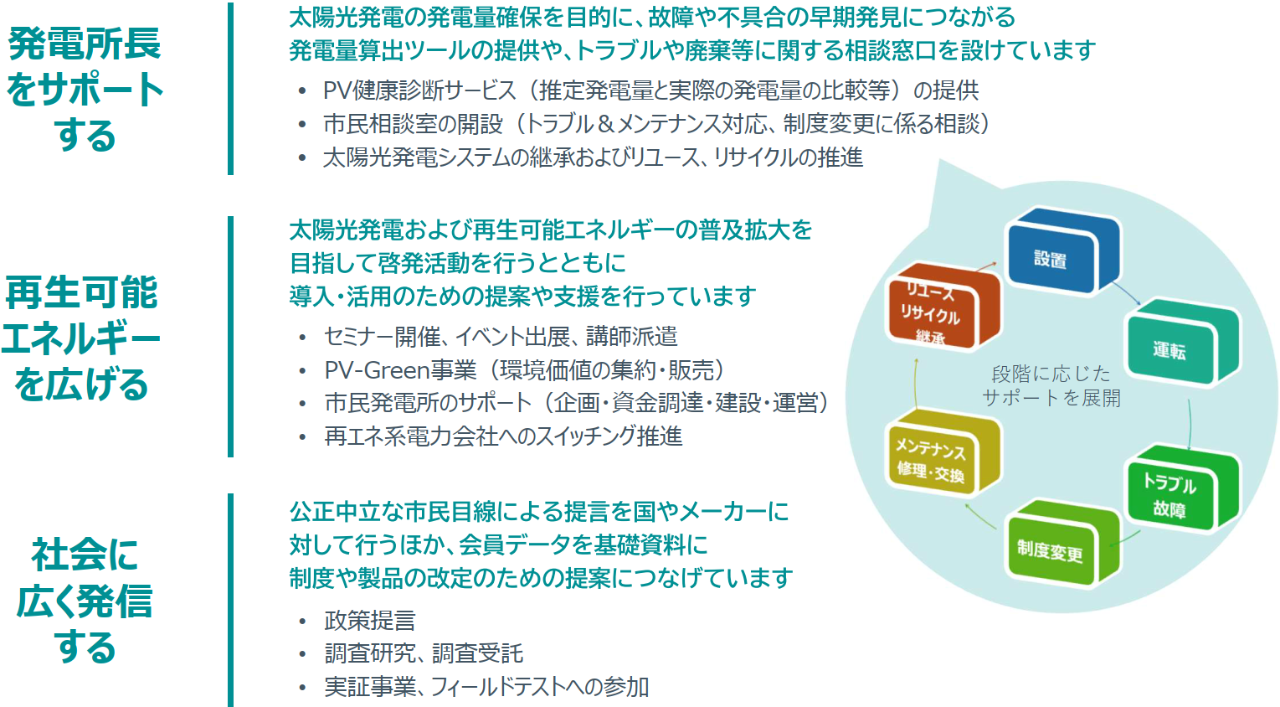 皆さまからの会費は、会員の皆さまにとってより価値あるサービスを提供できるようPV健康診断の改良、情報発信や交流機会の充実など、サービス向上に注力してまいります。また会費は私たちが掲げる「気候変動の抑止」という重要な使命を果たすための原動力ともなっております。今後も持続可能な社会の実現に向けた取り組みを一層強化してまいります。