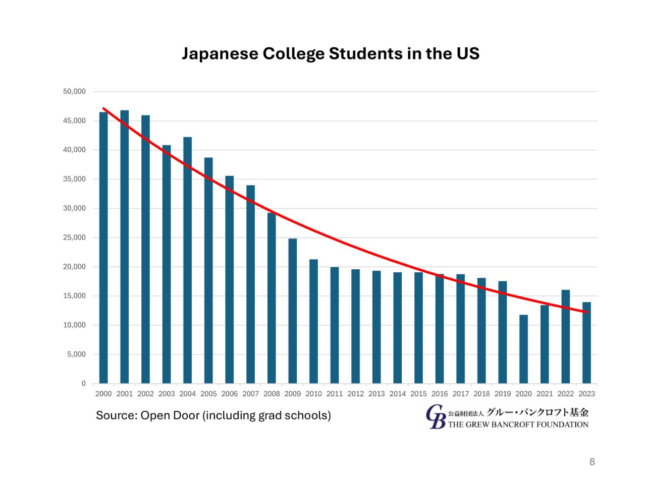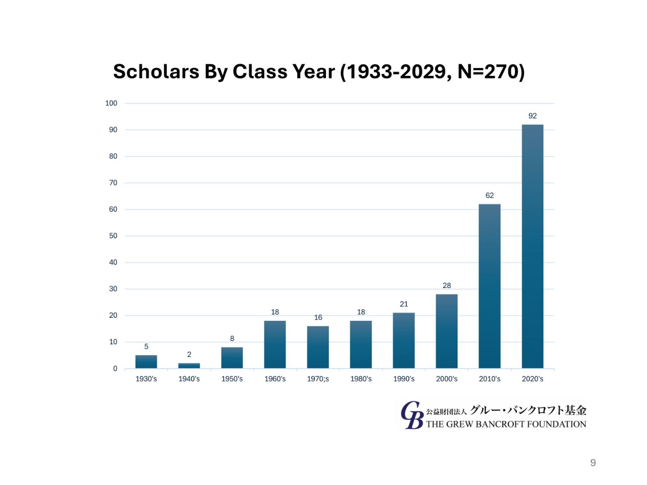 創設から約100年、これまでに224名の基金奨学生が40を超える米国の4年制大学を卒業し、民間企業、政府機関、国際機構、大学・研究所、メディア、市民社会団体等の多様な場で活躍してきました。この30年間程、日本からの米国へ留学する大学生数は低下していますが、皆様の支援を基に奨学生の人数は上昇傾向にあり、毎年10名程の奨学生を米国に送り出しています。