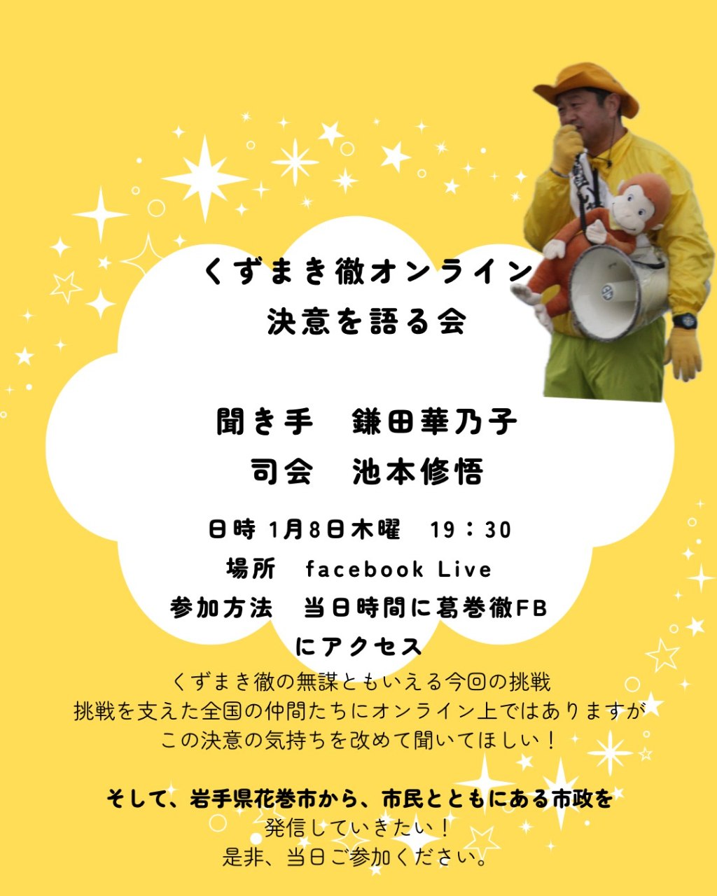 1/8(木)19時半よりオンラインにて【くずまき徹オンラインで決意を語る会】を開催させて頂きます!どなたでもご参加できます。葛巻徹の個人FBにて配信させて頂きます!