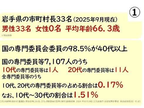 岩手県の33市町村の首長さんは全て男性、40歳代は1名のみという状況です。