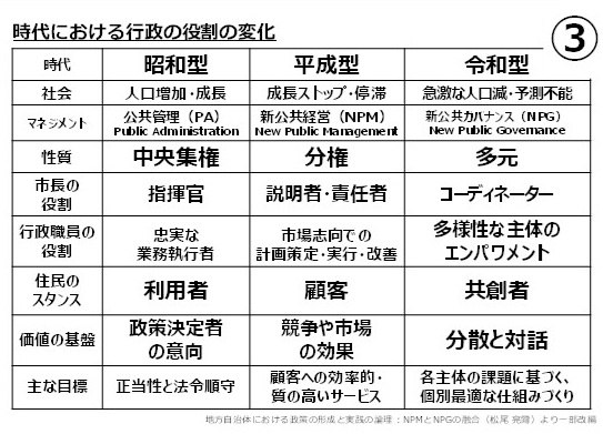 これまでの一般的な昭和型リーダーも大切なのですが、社会は大きく変わっています。市民が市役所からサービスを受けるだけでは、地球温暖化も人口減少も対応できない社会。みんなで創っていくからこそ、その地域、その課題にあった解決策がつくれます。市長や市役所の役割の転換。これを葛巻徹は民間側から実践してきました。この経験を今度は行政側からも進めていくことで、これからのまちづくりの体制ができると思います。