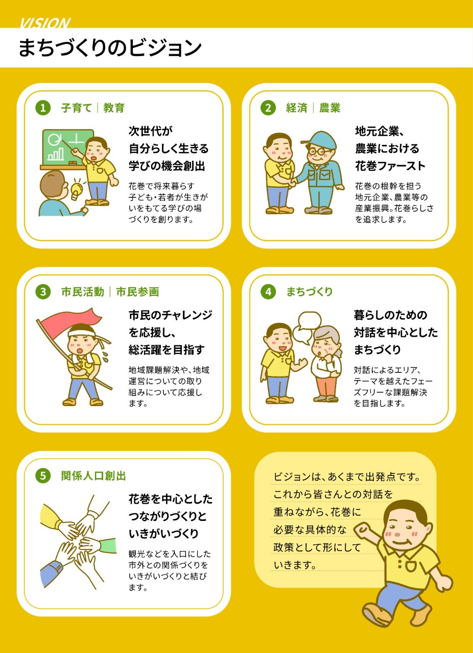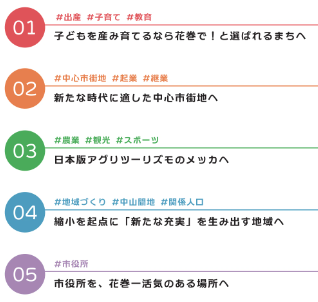 車座座談会での皆さんとの対話からつくったこの政策集。しかし、これはまだ完成ではありません。この政策集を具体的に実行する手法等については、まだまだ皆さんとの対話が必要です。「市民一人ひとりの挑戦が応援される花巻」を実現するためのこの政策集を是非ご覧ください。5つの重点施策で訴えています。