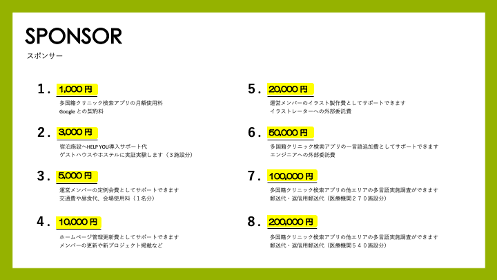 ヘルプユープロジェクトは、皆さまからのご支援で成り立っています。新プロジェクト『中国語版 HELP YOU』や『多国籍クリニック検索アプリの他県展開』を進めていくためにも、ご支援のほどよろしくお願いします。運営メンバー皆さん、プロボノとして活動いただいているので、定期的にギフトをプレゼントしたり、活動費(交通費等)をお支払いしたいと思っています。