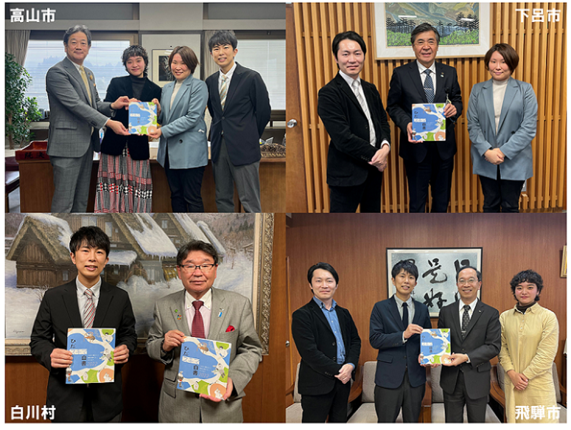 この度、高山市 田中明市長、飛騨市 都竹淳也市長、下呂市 山内登市長、白川村 成原茂 村長、飛騨地域3市1村の首長の皆様のところへ訪問し、「ひだスキマ白書2022」完成のご報告をさせていただきました。