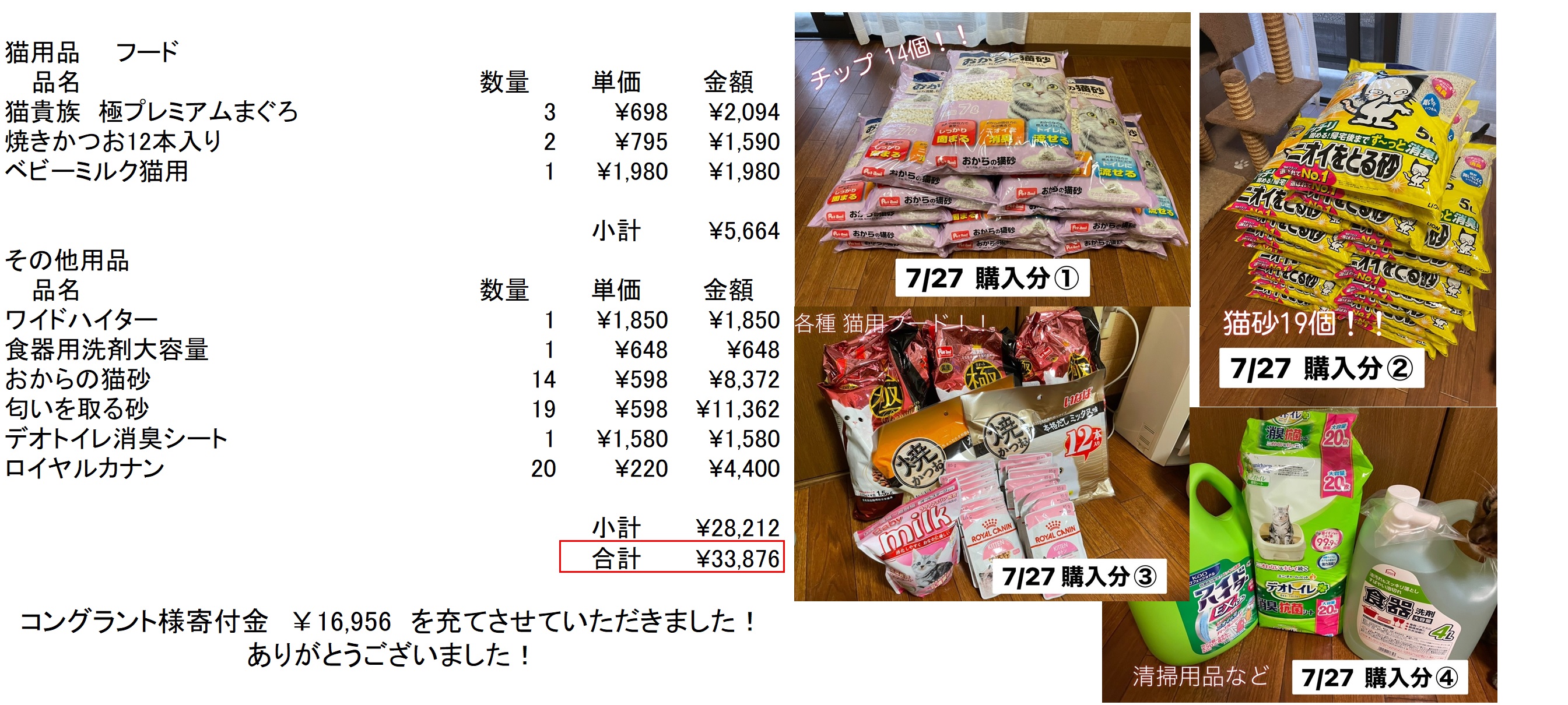 また、6月と7月にかけてコングラント様を通じて寄付金を頂戴しました。総額が16,956円でした。この寄付金は犬猫たちが快適に暮らすために今月も物品の購入資金に充てさせていただきました。下に明細と写真を掲載させていただきます。
