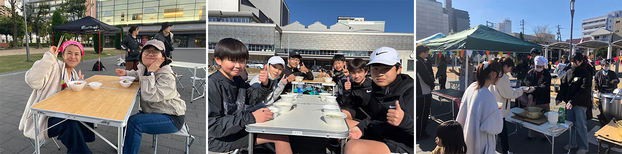 誰もがふらっと立ち寄れる「まちのダイドコロ」をつくる取り組みで、300食分の豚汁とごはんを炊き出しし、温かい食事と遊びの時間を届けています。事前申し込みは不要で、高校生以下の子どもには無料で提供しています。