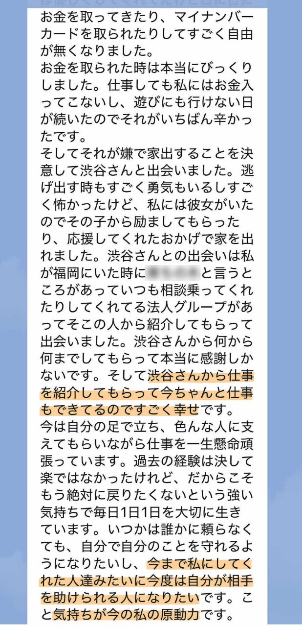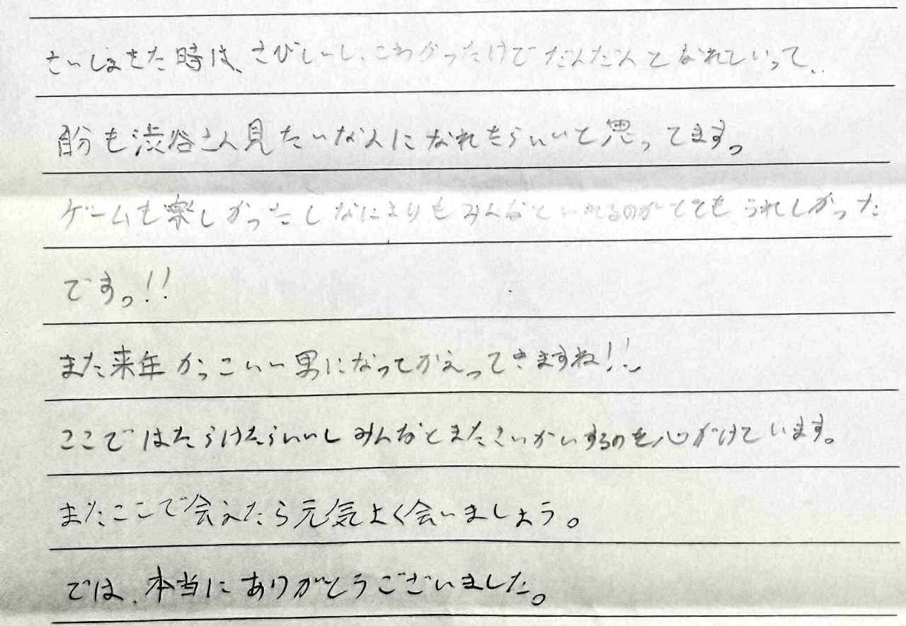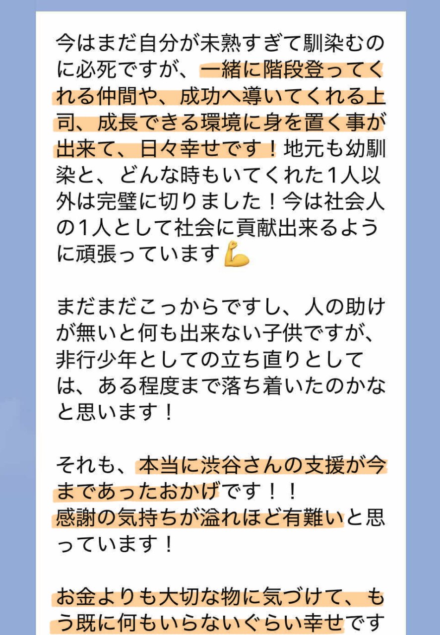 自分の過去を恨んだ事もあったが、今ではそのような経験ができたことを誇りに思えるようになり、僕の将来の目標は困っている人を助けられる大人になる事。