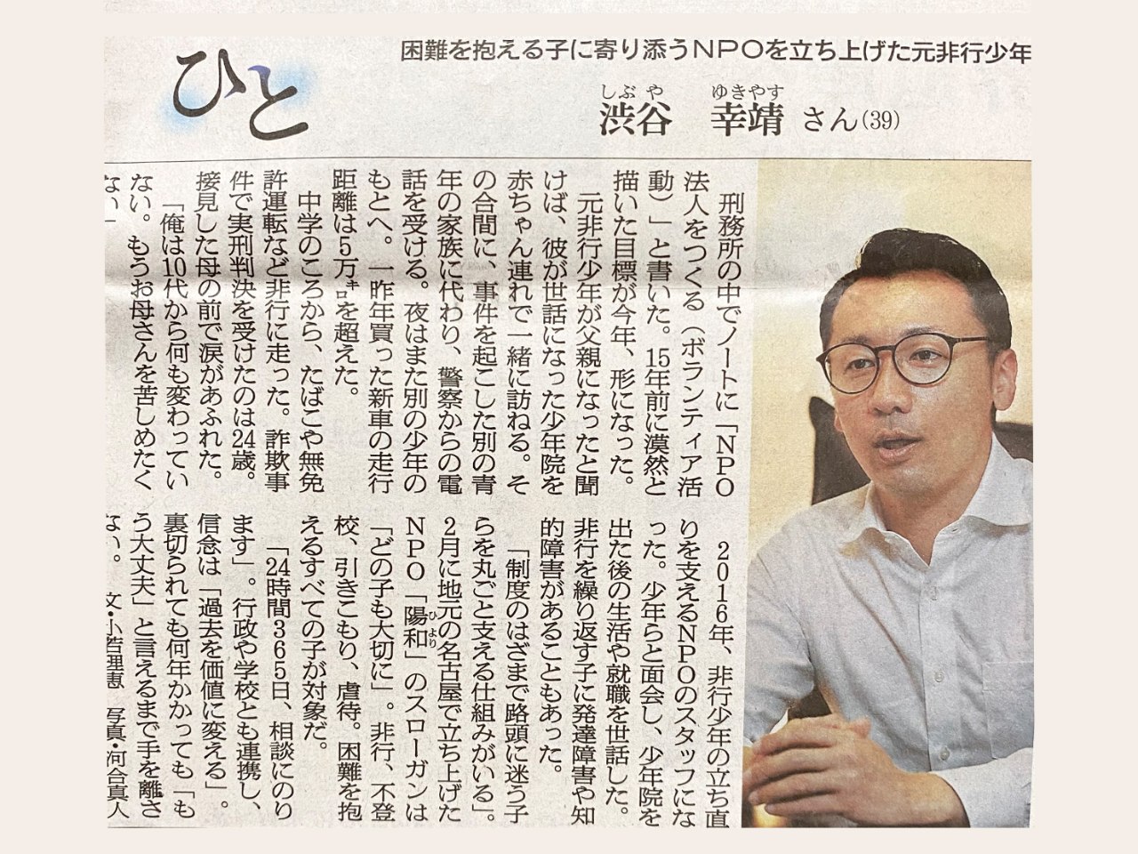 非行少年の支援をしているNPO法人で5年間活動を行い、2021年、「どの子も大切に」をテーマに、虐待を受けた子どもや、発達障がい、引きこもり、不登校、非行など、困難を抱えた子ども達に寄り添う団体として、NPO法人陽和を設立。