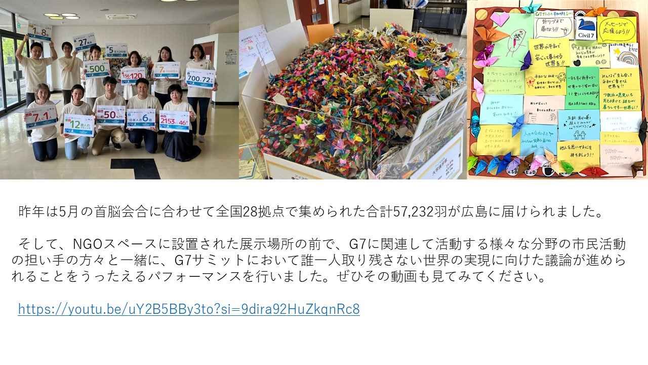 2024-05-15 03:00折り鶴に込めた想いを届ける「SDGs折り鶴プロジェクト」昨年、G7広島サミットに向けて、全国各地から市民一人ひとりの想いを届けた「SDGs折り鶴プロジェクト」を、今年は広島からローマへつなげていきます。 今年は、昨年広島に届けられなかった四国で折られた折り鶴が、今回のプロジェクトのメンバーである高橋さんに託されてイタリアへと送られ、広島に寄せられた思いのバトンは確実につながっています。 皆さんもG7までの期間に、「#SDGsORIZURU」「#G7イタリア」をつけて想いを、声を一緒に発信していきましょう!2024-05-15 03:00折り鶴に込めた想いを届ける「SDGs折り鶴プロジェクト」昨年、G7広島サミットに向けて、全国各地から市民一人ひとりの想いを届けた「SDGs折り鶴プロジェクト」を、今年は広島からローマへつなげていきます。 今年は、昨年広島に届けられなかった四国で折られた折り鶴が、今回のプロジェクトのメンバーである高橋さんに託されてイタリアへと送られ、広島に寄せられた思いのバトンは確実につながっています。 皆さんもG7までの期間に、「#SDGsORIZURU」「#G7イタリア」をつけて想いを、声を一緒に発信していきましょう!