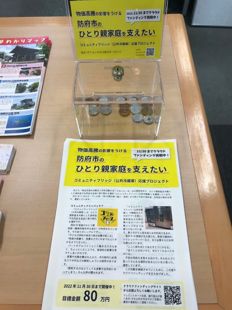 私たち「特定非営利活動法人市民活動さぽーとねっと」は、山口県防府市で、ひとり親家庭を対象にした食料品や日用品を自由に受け取れる場所「コミュニティフリッジ(公共冷蔵庫)」を運営しています。
