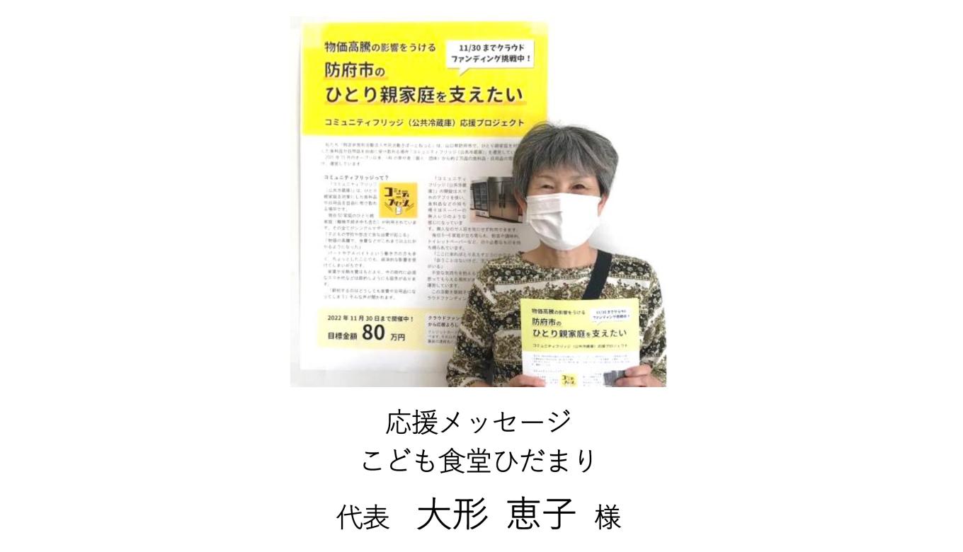 【プロジェクト21日目 31%達成】 こども食堂ひだまり 大形 恵子様より、応援メッセージをいただきました!