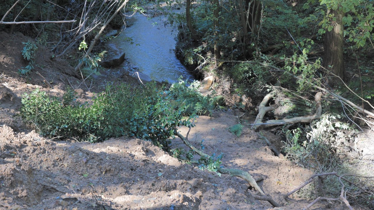 (浄水場へと続く道はいたるところでがけ崩れが発生していました)