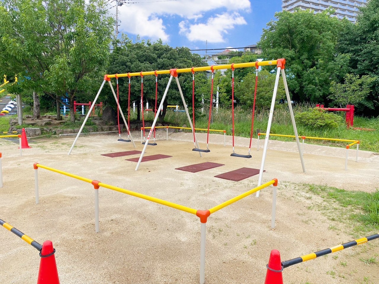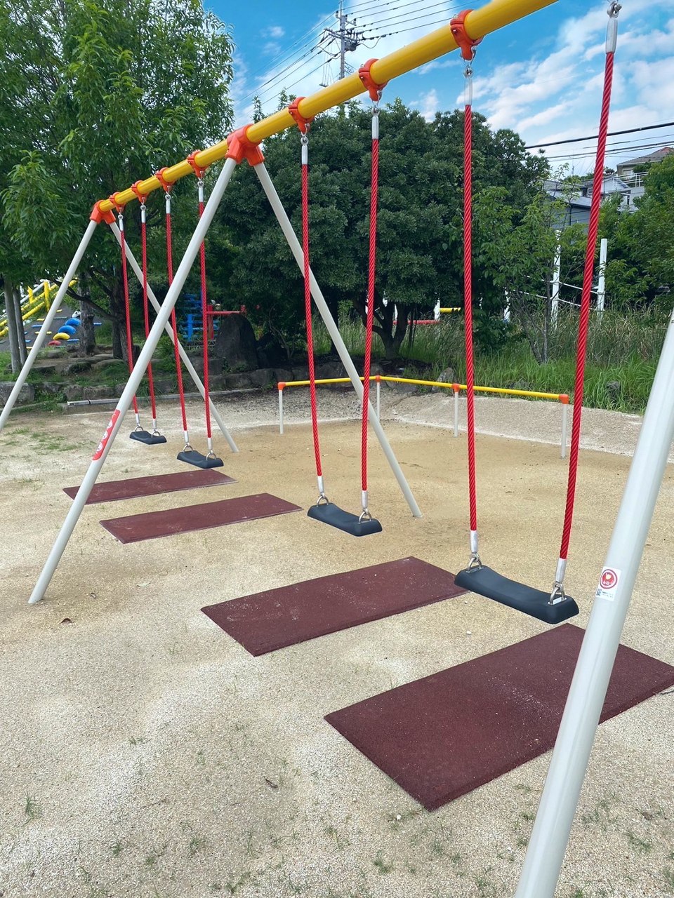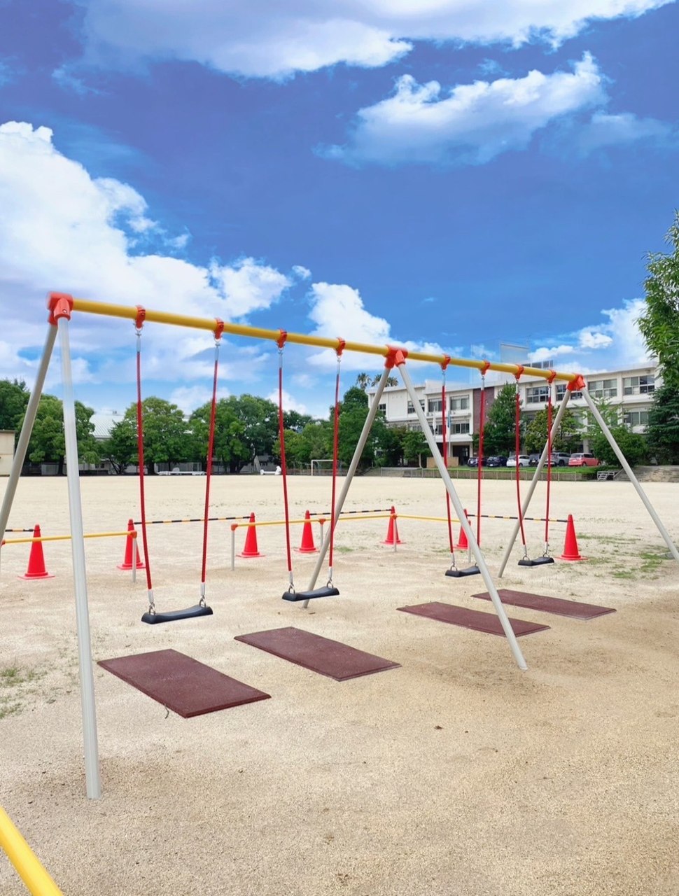 子どもたちが安心安全に遊べるようにエリアに柵を設け、ブランコは鎖ではなくロープにする事で、手をケガしない工夫がされています。また地面が削れないように合成ゴムを設置する事で、水たまりができないよう施工されてます☺
