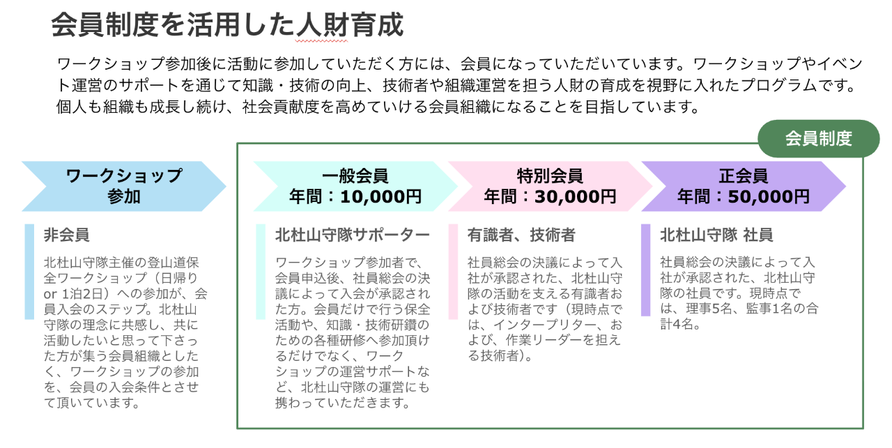 北杜山守隊は、登山道の保全活動を持続可能な活動とするために、行政の予算や補助金、ボランティアのみに依存しない仕組みづくりを追及しています。その仕組みづくりで課題となるのが「人財」と「財源」。我々は、会員制度を「人財」という大きな課題への重要なアプローチと位置づけ、将来にわたって担い手不足を起こさないためのプログラム設計しました。
