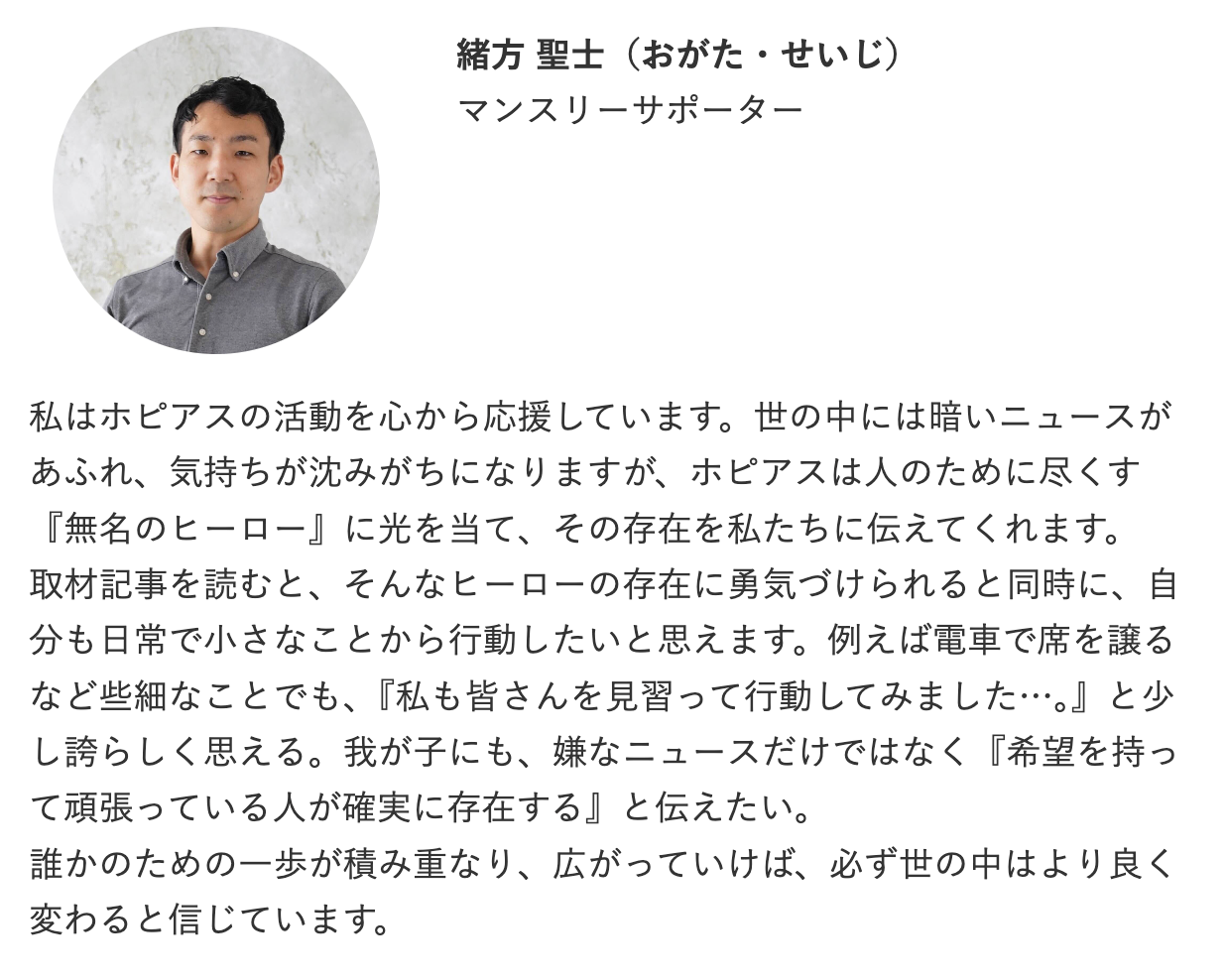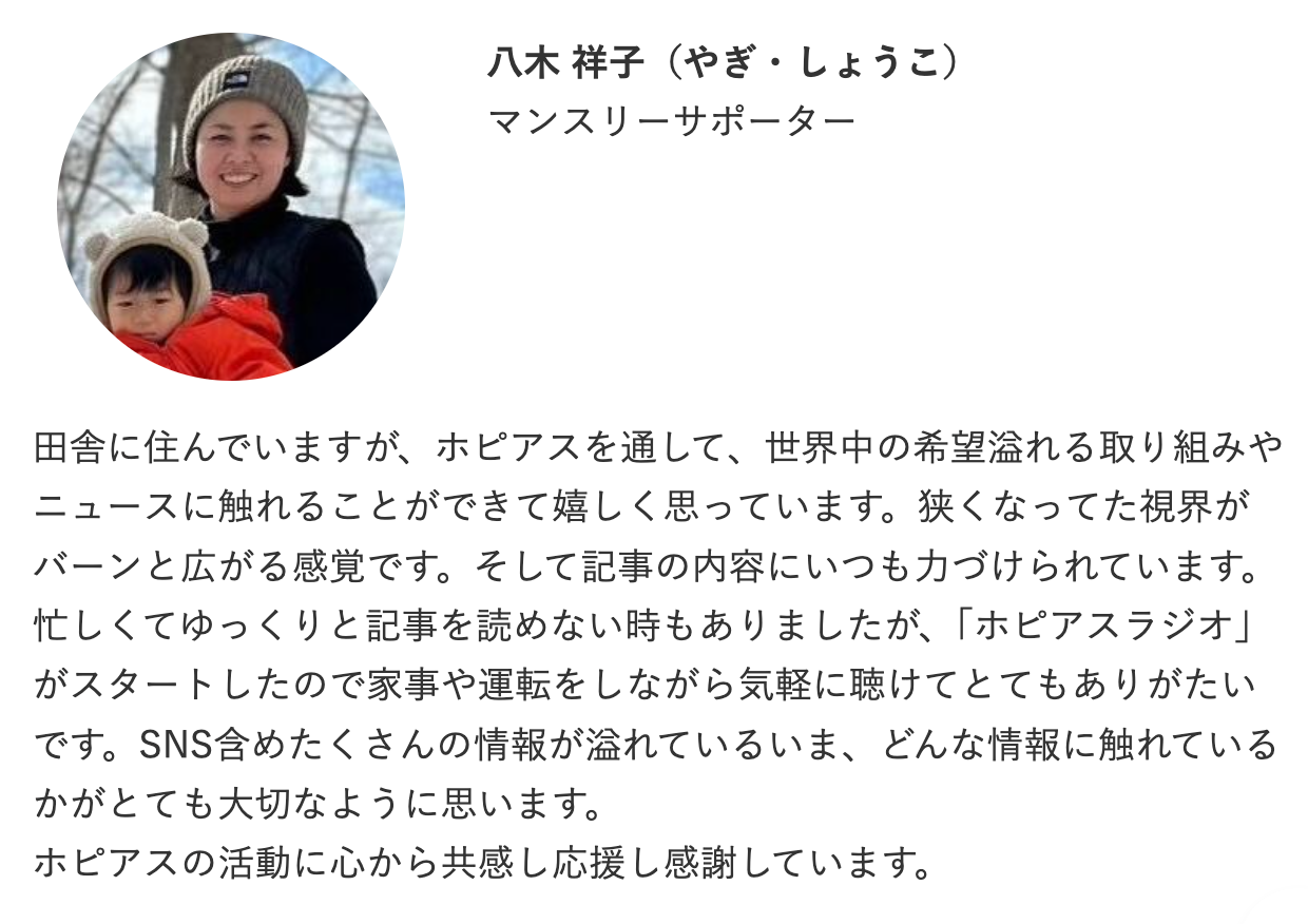 ホピアスの読者には、コンセプトに共感し、自分ごととして記事を読んでくださる方が多いのが特徴です。記事を通じて、読者の心の中に小さな「希望の火」が灯っていく──そんな手応えを感じています。ここでは、その一つを抜粋してご紹介します。