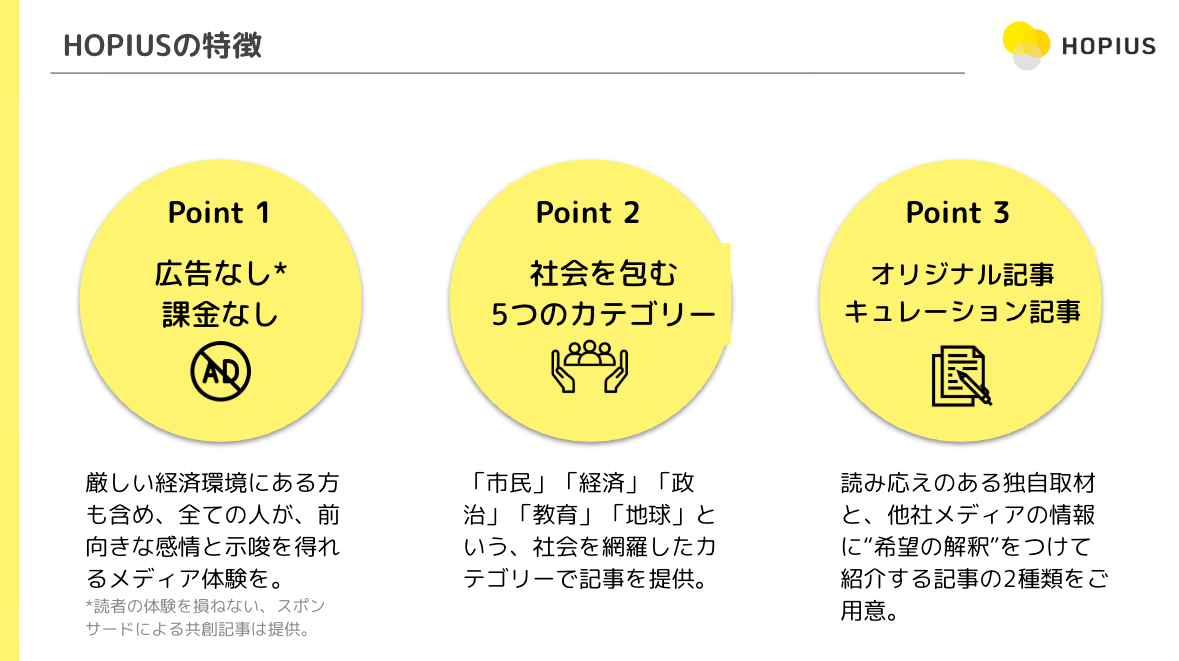 このようにホピアスは、読者の皆さんが関わることで、「日常にワクワクや希望を感じる」「誰かを応援する」「より良い未来に向けて行動する」──そんな希望の循環が広がっていくことを目指しています。