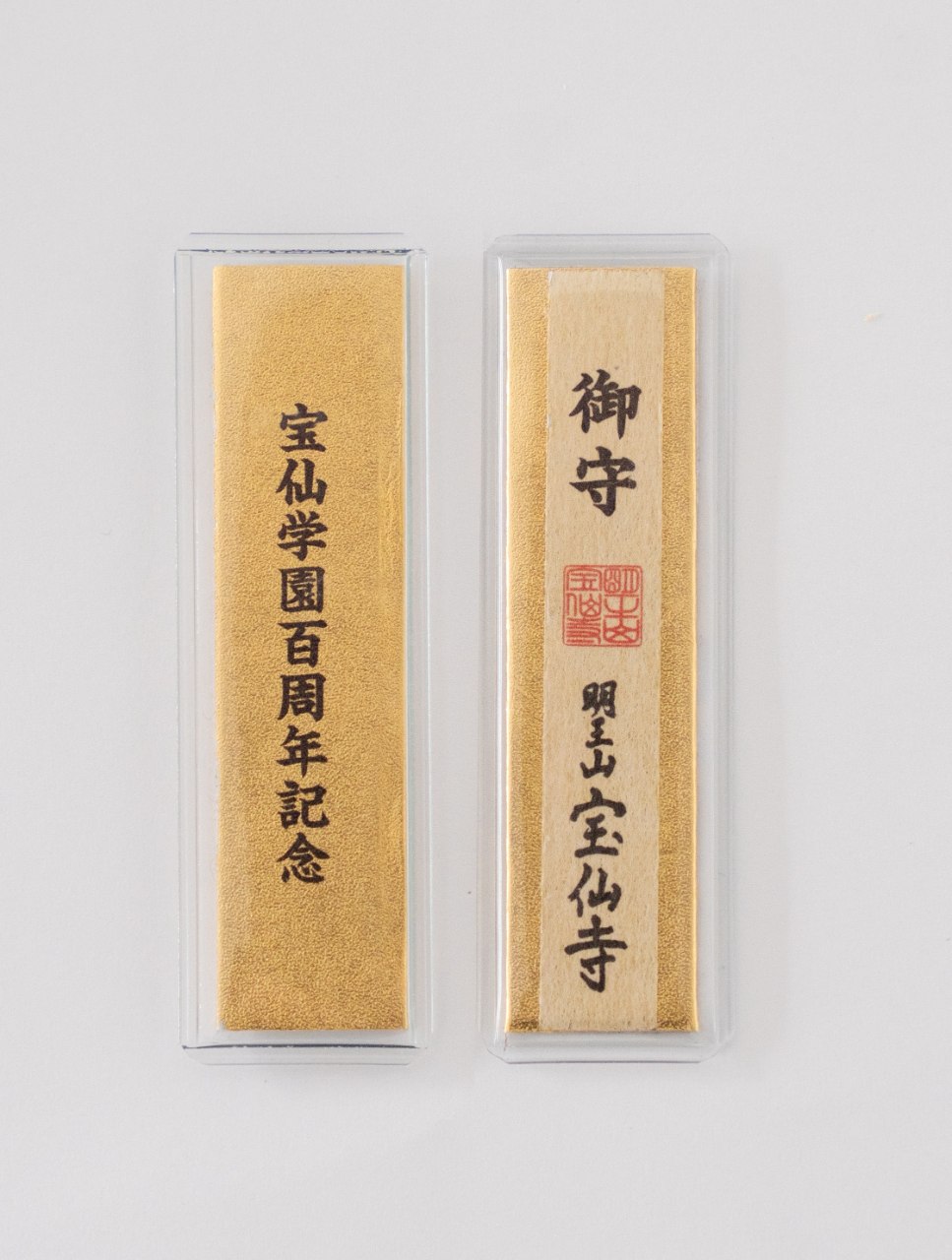 宝仙寺御守。縦幅7cm・横幅2cm・厚さ2mm