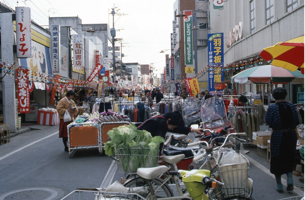 なかでもJR二日市駅と西鉄二日市の間に位置する中央通り商店街は、最盛期の昭和40年代には江島屋、丸衆、武石と3つの大型店の周囲に肉屋、パン屋、書店などの小売店が並び、さらに近隣からの野菜や魚介類を積んだリアカー部隊がひしめくにぎやかさでした。