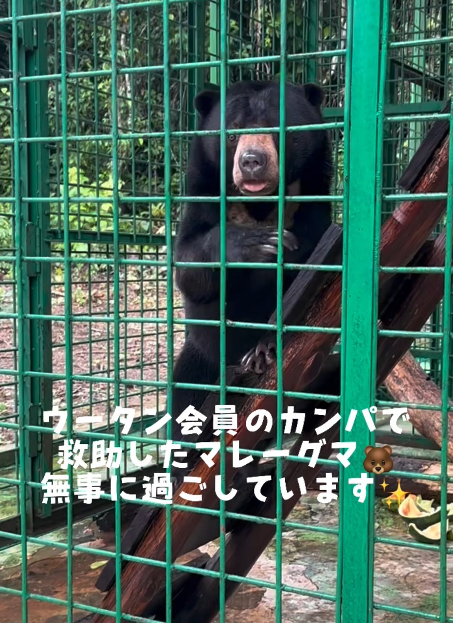 2024-01-24 08:30カンパにより救助されたマレーグマも無事に過ごしていました!昨年、ウータン会員のカンパによって救助・輸送されたマレーグマも無事に過ごしていました! ロンサム野生動物レスキューセンターは、支援を受けやすいオランウータン以外の動物にも救いの手を差し伸べることを目的としています。 現在は、1頭のマレーグマの他に、10頭のテナガザル、1頭のビントロング、1羽のサイチョウがいます。マレーグマは開発地で救助、ビントロングは違法飼育、サイチョウは羽が折れてしまったなど様々な理由でここに来ているとのことです。 マレーグマの動画は以下からご覧いただけます。 https://x.com/HUTANGroupJAPAN/status/1749779271751815320?s=20 https://www.instagram.com/p/C2cZqZlPhWA/?hl=ja https://web.facebook.com/reel/2861335678026772024-01-24 08:30カンパにより救助されたマレーグマも無事に過ごしていました!昨年、ウータン会員のカンパによって救助・輸送されたマレーグマも無事に過ごしていました! ロンサム野生動物レスキューセンターは、支援を受けやすいオランウータン以外の動物にも救いの手を差し伸べることを目的としています。 現在は、1頭のマレーグマの他に、10頭のテナガザル、1頭のビントロング、1羽のサイチョウがいます。マレーグマは開発地で救助、ビントロングは違法飼育、サイチョウは羽が折れてしまったなど様々な理由でここに来ているとのことです。 マレーグマの動画は以下からご覧いただけます。 https://x.com/HUTANGroupJAPAN/status/1749779271751815320?s=20 https://www.instagram.com/p/C2cZqZlPhWA/?hl=ja https://web.facebook.com/reel/286133567802677