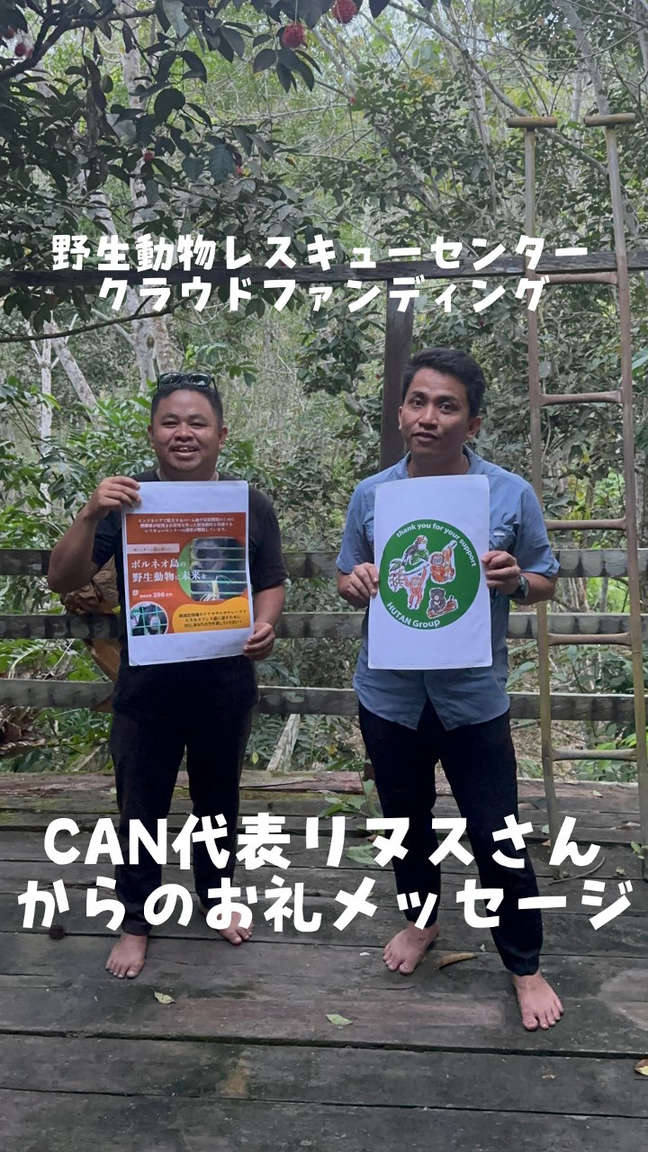 2024-04-17 11:01ロンサム野生動物レスキューセンターへのご支援をいただき誠にありがとうございました!本クラウドファンディング「ボルネオ島の野生動物に未来を。一頭でも多くの命を救いたい。」では、305人の方から、2,123,448円ものご寄付をいただきました。 たくさんの方にこの活動を支えていただき、大変感謝しております。 ありがとうございました! いただいたご寄付は、運営するCAN(Conservation Action Network)を通して、動物の餌代や獣医師の人件費などに使います。 すでに100万円をCANに送金しました。送金額の上限等を考慮しながら、残りも速やかに送金の手続きに入ります。 応援コメントの一部や現地からのお礼コメントを掲載しますのでご覧ください!2024-04-17 11:01ロンサム野生動物レスキューセンターへのご支援をいただき誠にありがとうございました!本クラウドファンディング「ボルネオ島の野生動物に未来を。一頭でも多くの命を救いたい。」では、305人の方から、2,123,448円ものご寄付をいただきました。 たくさんの方にこの活動を支えていただき、大変感謝しております。 ありがとうございました! いただいたご寄付は、運営するCAN(Conservation Action Network)を通して、動物の餌代や獣医師の人件費などに使います。 すでに100万円をCANに送金しました。送金額の上限等を考慮しながら、残りも速やかに送金の手続きに入ります。 応援コメントの一部や現地からのお礼コメントを掲載しますのでご覧ください!