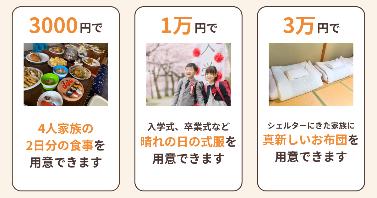 シェルターには、国や県からの補助もありますが、すべての費用を公費で賄えるわけではありません。当面の食費さえも持っていない人、夫に住所を知られずに病院を受診するため、やむなく医療費を実費負担とする場合もあります。また、夜間に急に不安を訴える入居者への緊急対応など、公的な制度ではカバーできない、柔軟できめ細やかな対応が求められる部分は、ご寄付によって支えられています。