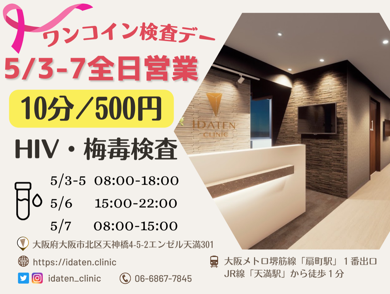 5月3日から7日まで行ったワンコイン検査デーが大好評であり、今回は5月27日から28日までワンコイン(500円)でHIVと梅毒の検査を行えるキャンペーンを行いました。