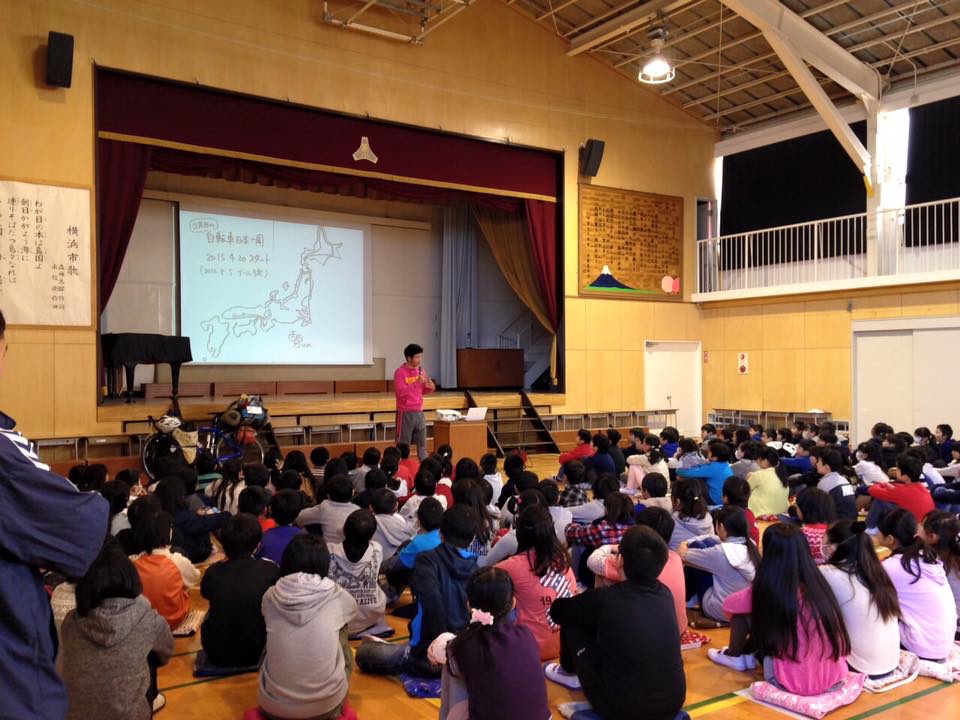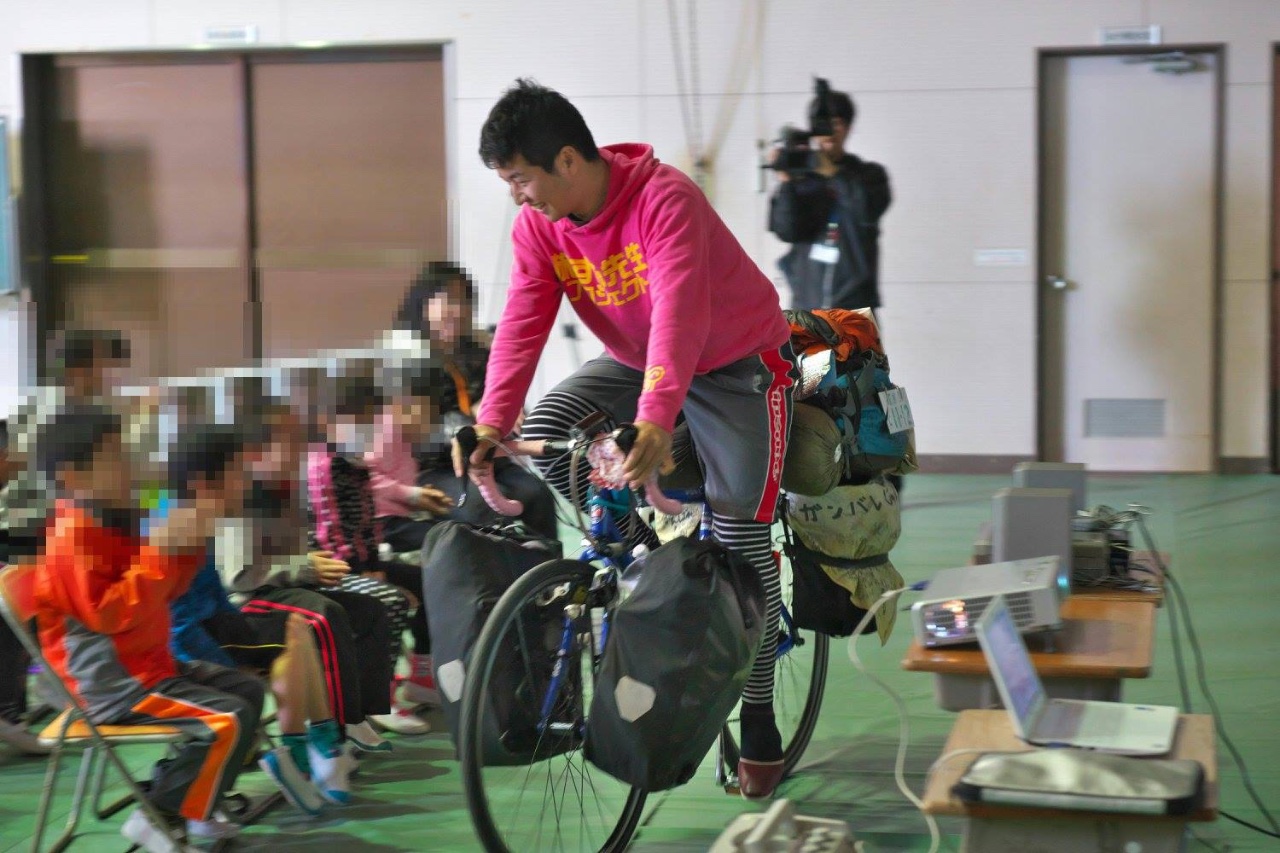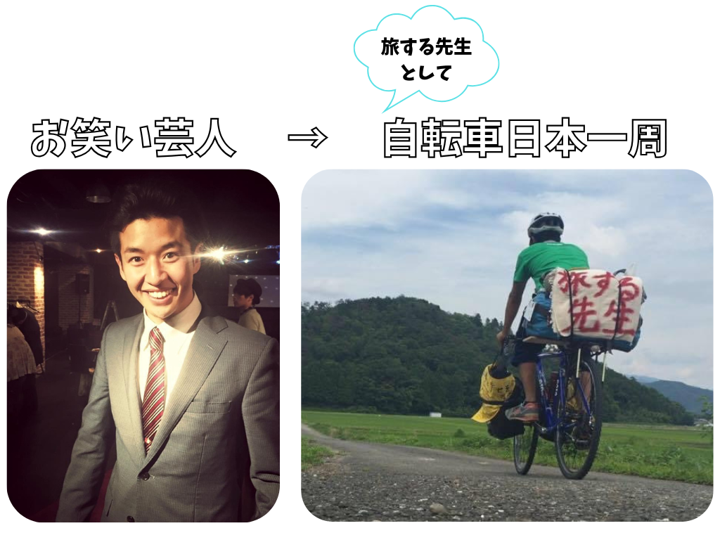 お笑い芸人という特殊な職業で経験した3年間の社会経験を基に、次は教育分野に挑戦しようと決めました。多彩な学校・教師・児童生徒の姿に触れて相互に学びを得る方法として「旅する先生プロジェクト」を考案し、自転車で日本一周しながら全国の学校で出張授業をしました。現在進行形で挑戦する自分自身の姿を教材として、全国の教室へ飛び込んで行ったのです。