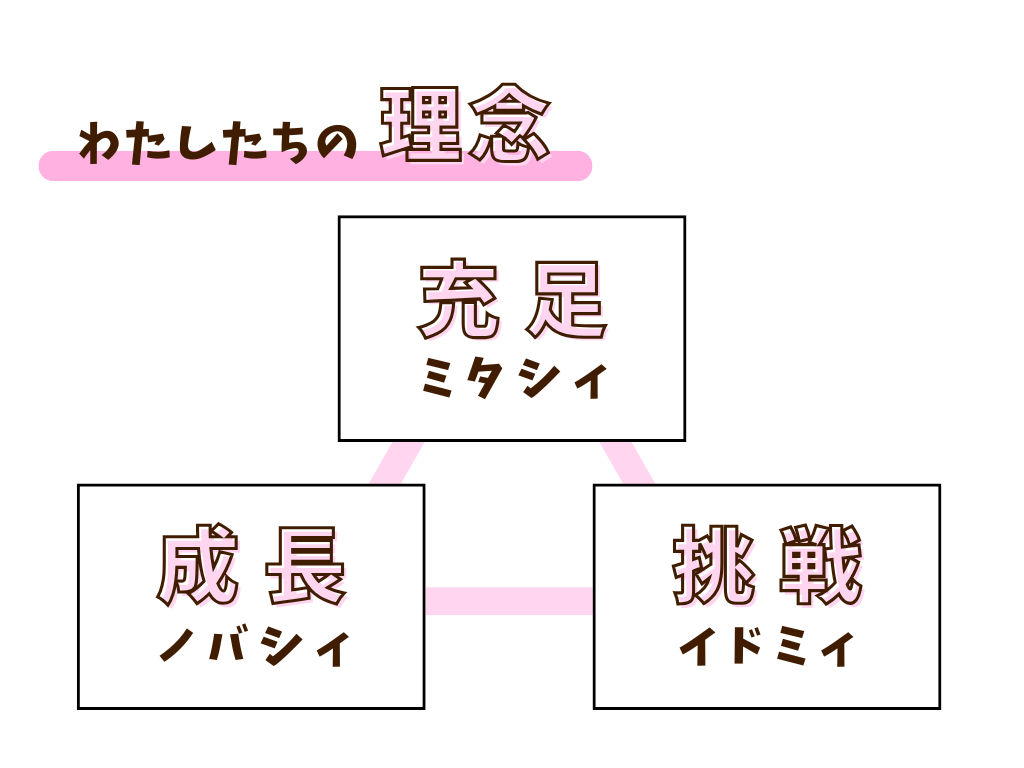 そうして始まったイドミィが大切にしている「理念」をお伝えします。それは「充足・成長・挑戦」です。わかりやすく言うと、「認める・満たす、伸ばす、挑む」です。もっとわかりやすく言うと、「ミタシィ・ノバシィ・イドミィ」です(わかりにくい?笑)。