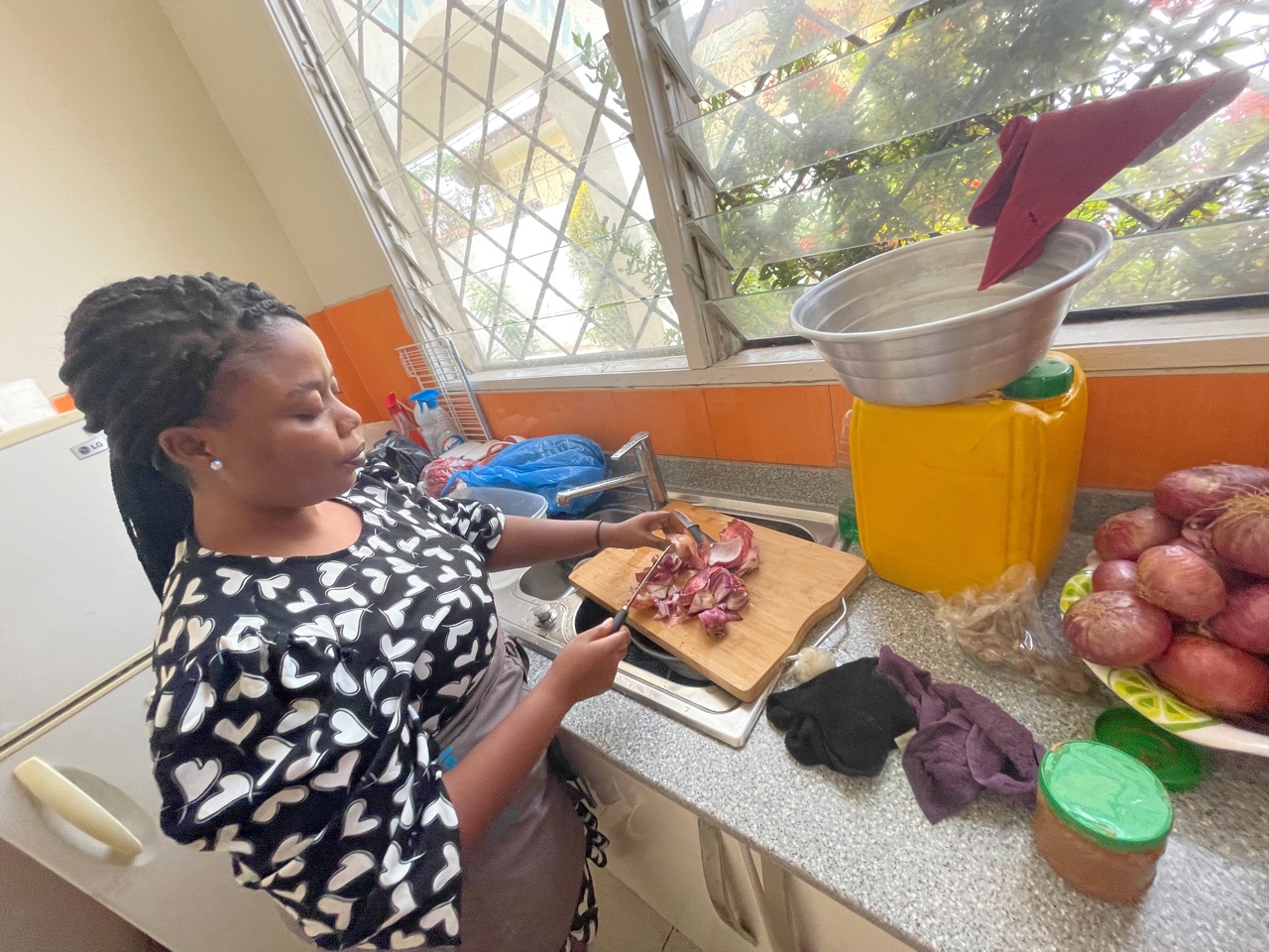 インナハウスの調理スタッフのナナマが腸チフスになってしまいました。2日間入院し、2週間休んでいました。その間は私がナナマの代わりに調理したのですが、試験がちょうど終わったアリを中心に、子どもたちみんなで助け合って給食を準備することができました。