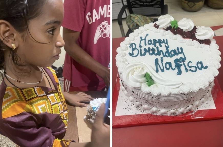 ナフィサにとって、生まれて初めての誕生日。みんなでケーキを食べて、おしゃれ大好きなナフィサへのプレゼントは洋服にしました。そして誕生日会が終わった直後から、もう「次の誕生日はいつ?!」と聞いてきました笑