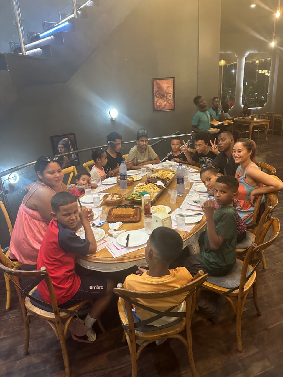 ガーナ料理とレバノン料理のミックスのレストランに行きました。このレストランでは、料理がとても大きな皿に盛られて運ばれてくるので、みんなでシェアして食べることができます。ものすごい量なので、食べても食べても食べきれません。残した分は持ち帰ってインナハウスで食べますが、難民でストリートチルドレンだった子どもたちは「どれほど食べても食べきれない」という体験をしたことがなかったので、彼らにとってそれは本当に幸せな時間なのだそうで、子どもたちは必ずこのレストランに来たがります。このレストランには外に子どもたちが自由に遊べる遊具がたくさんあり、子どもたちはご飯を食べた後、そこに遊びに来ていた他の子どもたちとかくれんぼをして遊んでいて、とても楽しそうでした。