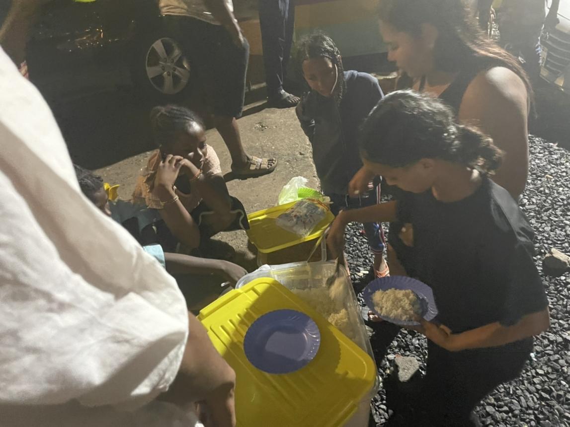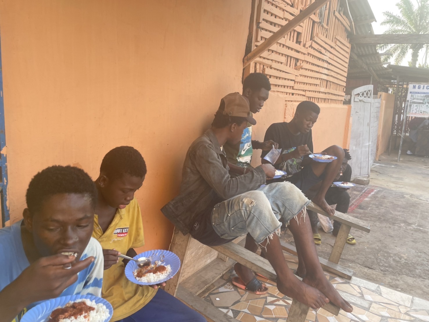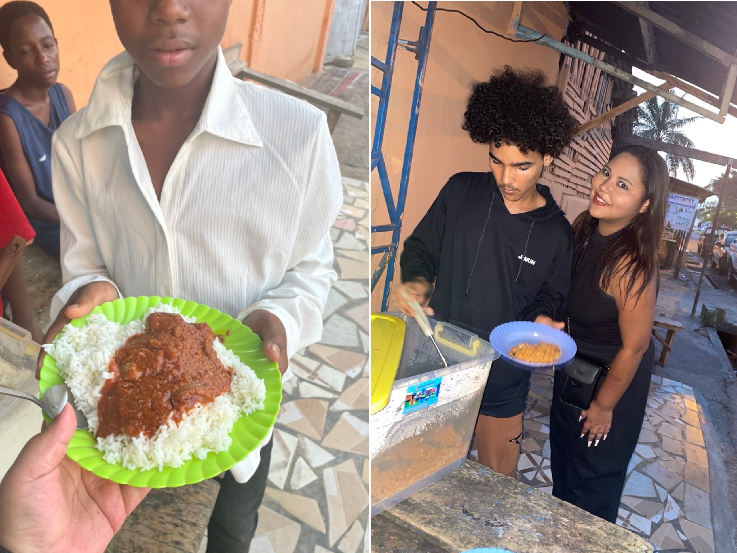 Inna Houseのシェフのナナマさんが作ったご飯を、アシスタントのヤンガストと一緒に、ストリートボーイズのいるところに持っていきます。