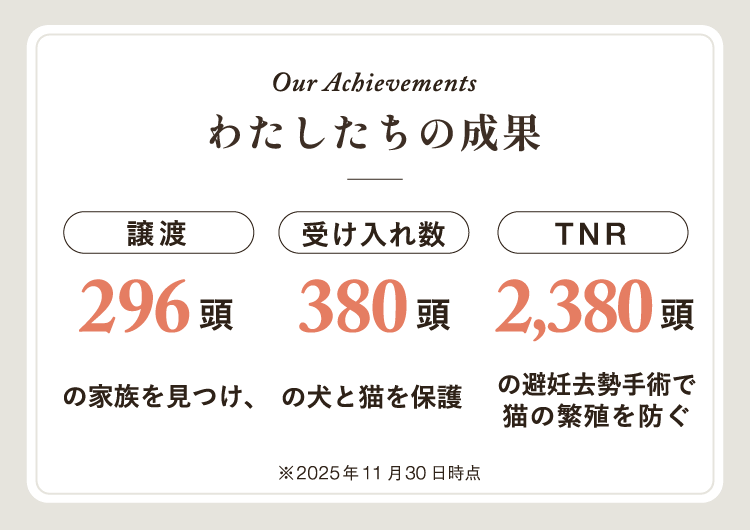 すべての動物と、その家族が幸せに生きられる、社会のために。私たちは、みんなでつくる、みんなでこの国を変えていく、財団です。