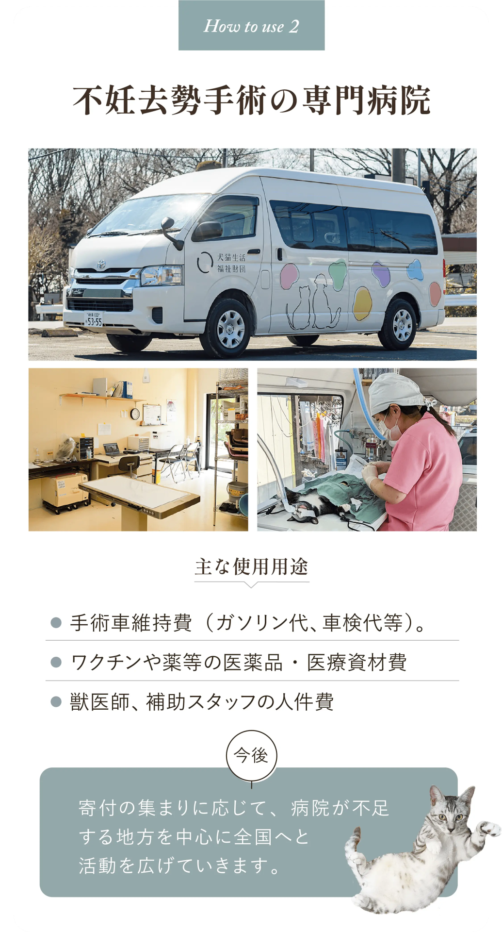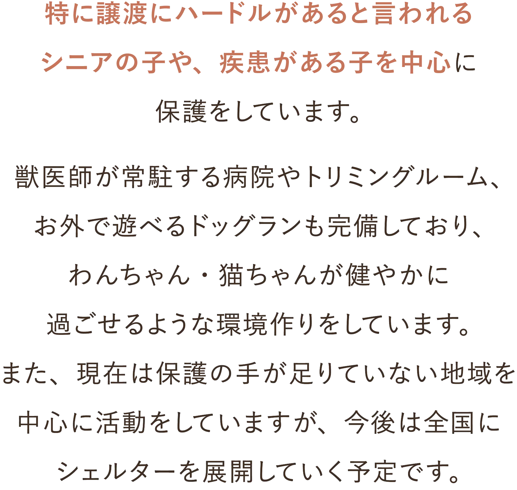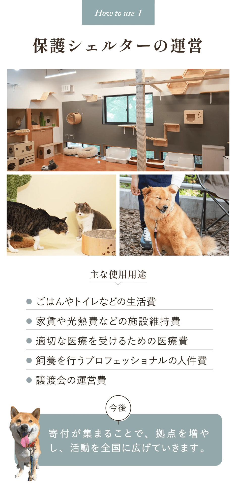 日本全国にシェルターを設置していくことで、犬・猫を保護。新しい家族との、しあわせな出会いを創出します。また、傷ついた犬・猫のケアや不妊去勢を行う専門クリニックの開業・運営、各地域にある保護団体への支援を実施。広く、多面的な活動を通して、犬と猫のいのちを、幸せを、守ります。