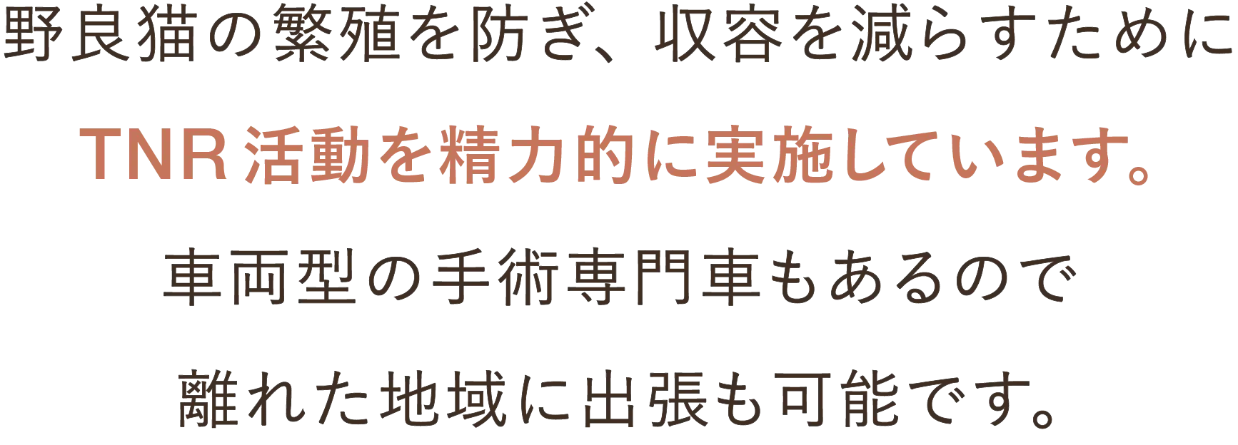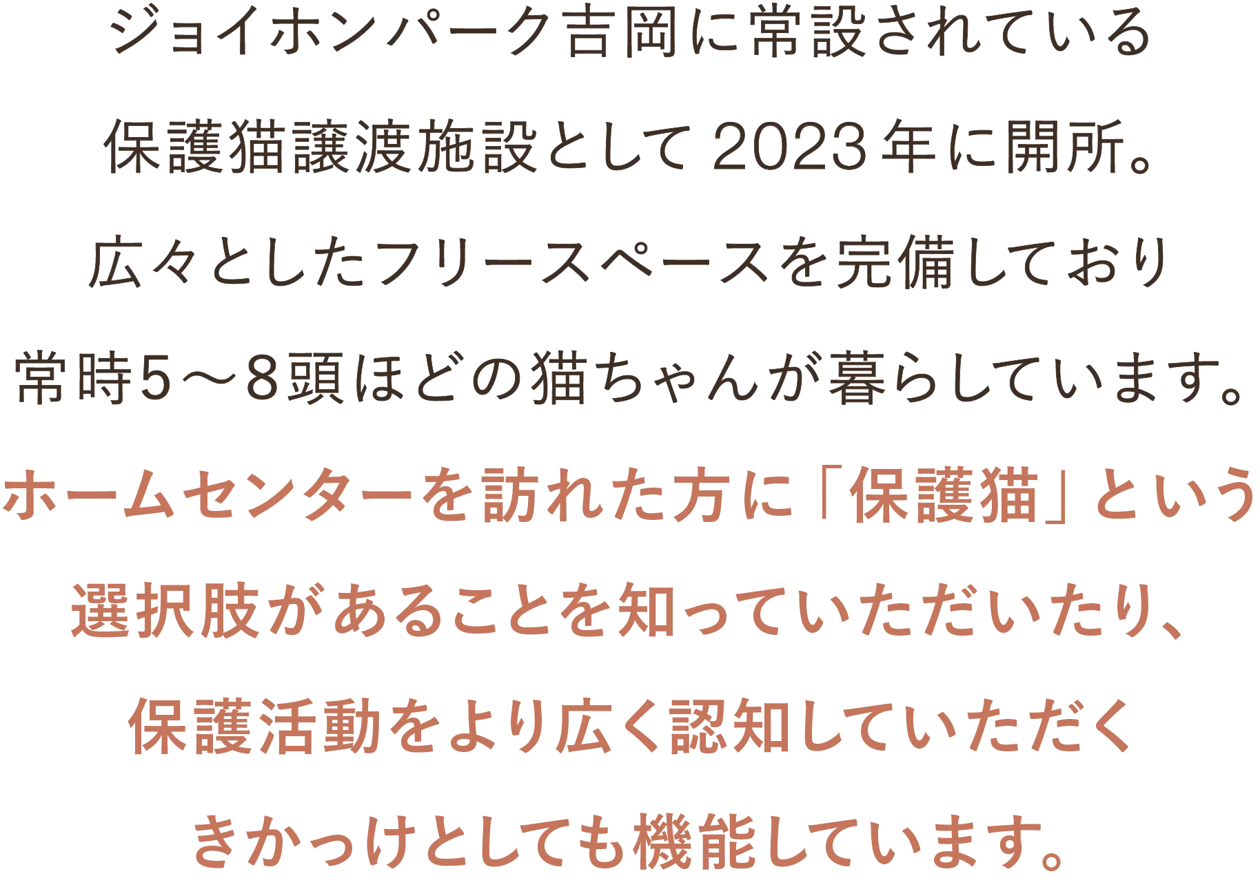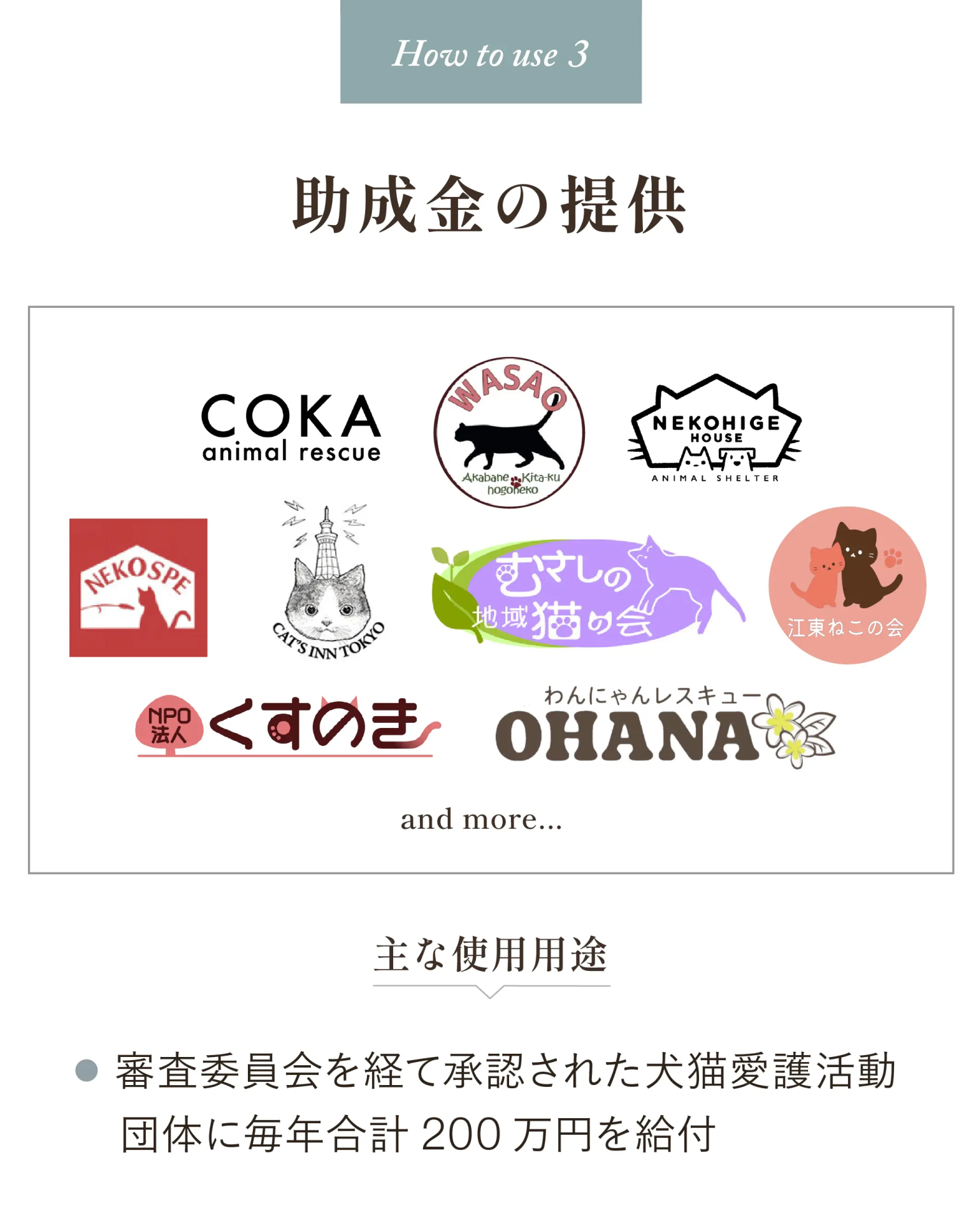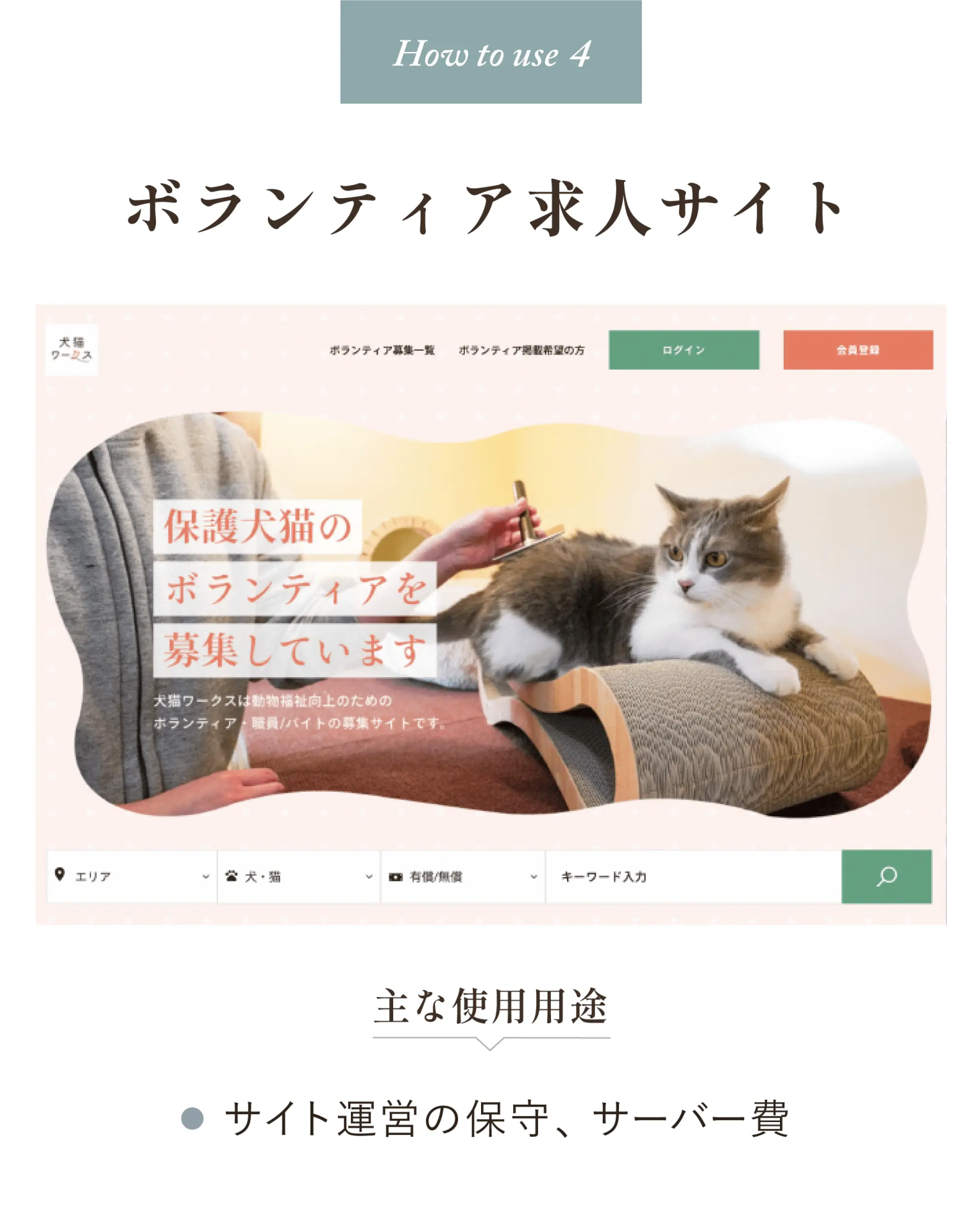 日本全国にシェルターを設置していくことで、犬・猫を保護。新しい家族との、しあわせな出会いを創出します。また、傷ついた犬・猫のケアや不妊去勢を行う専門クリニックの開業・運営、各地域にある保護団体への支援を実施。広く、多面的な活動を通して、犬と猫のいのちを、幸せを、守ります。