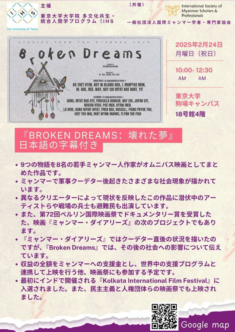 この度、東京大学大学院の多文化共生・統合人間学(IHS)プログラムと、一般社団法人国際ミャンマー専門家・専門家協会(ISMSP)がコラボし、2月24日に【『壊れた夢』(Broken Dreams)】の上映会と 『夢の再建』をテーマにパネルディスカッションを行いました。
