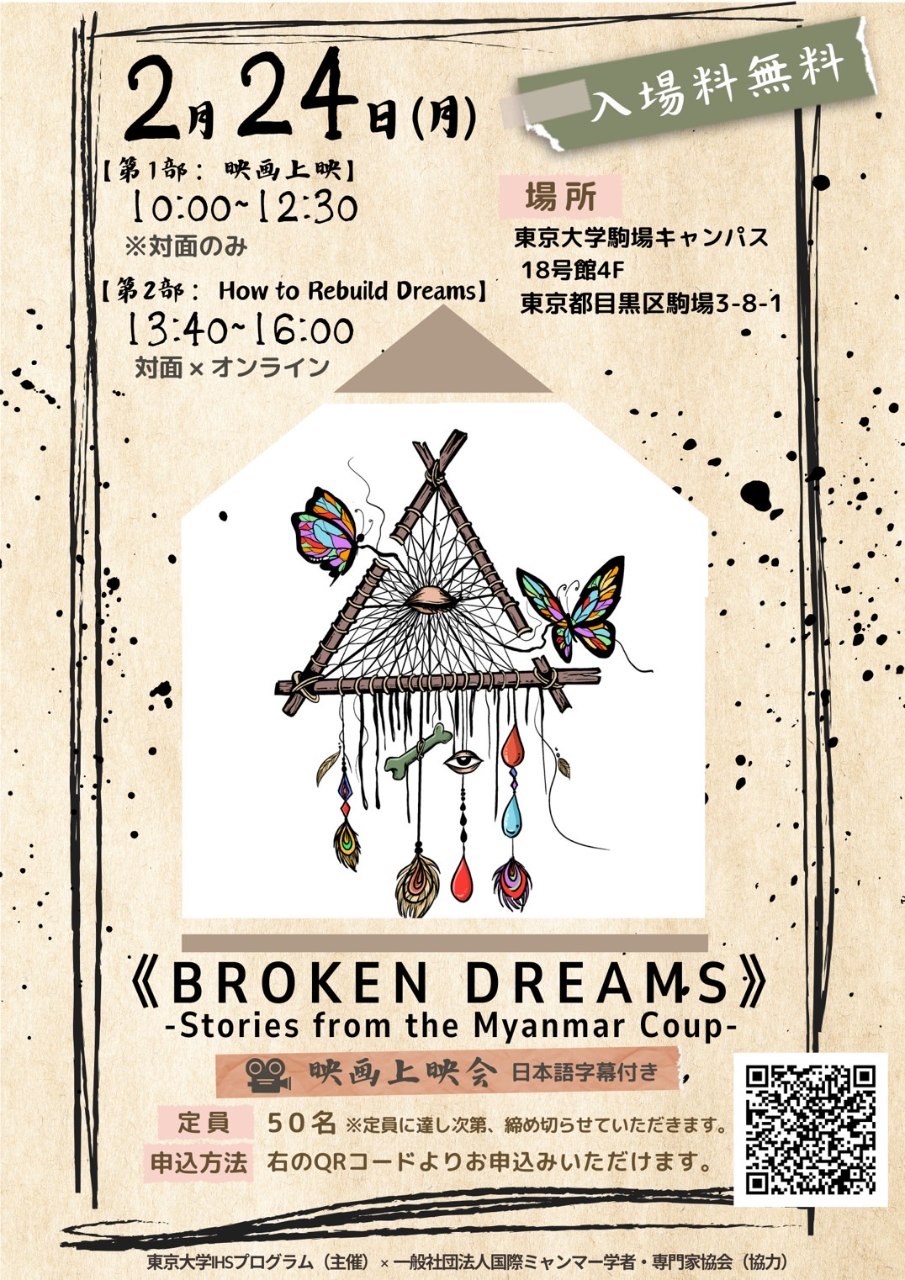 この度、東京大学大学院の多文化共生・統合人間学(IHS)プログラムと、一般社団法人国際ミャンマー専門家・専門家協会(ISMSP)がコラボし、2月24日に【『壊れた夢』(Broken Dreams)】の上映会と 『夢の再建』をテーマにパネルディスカッションを行いました。