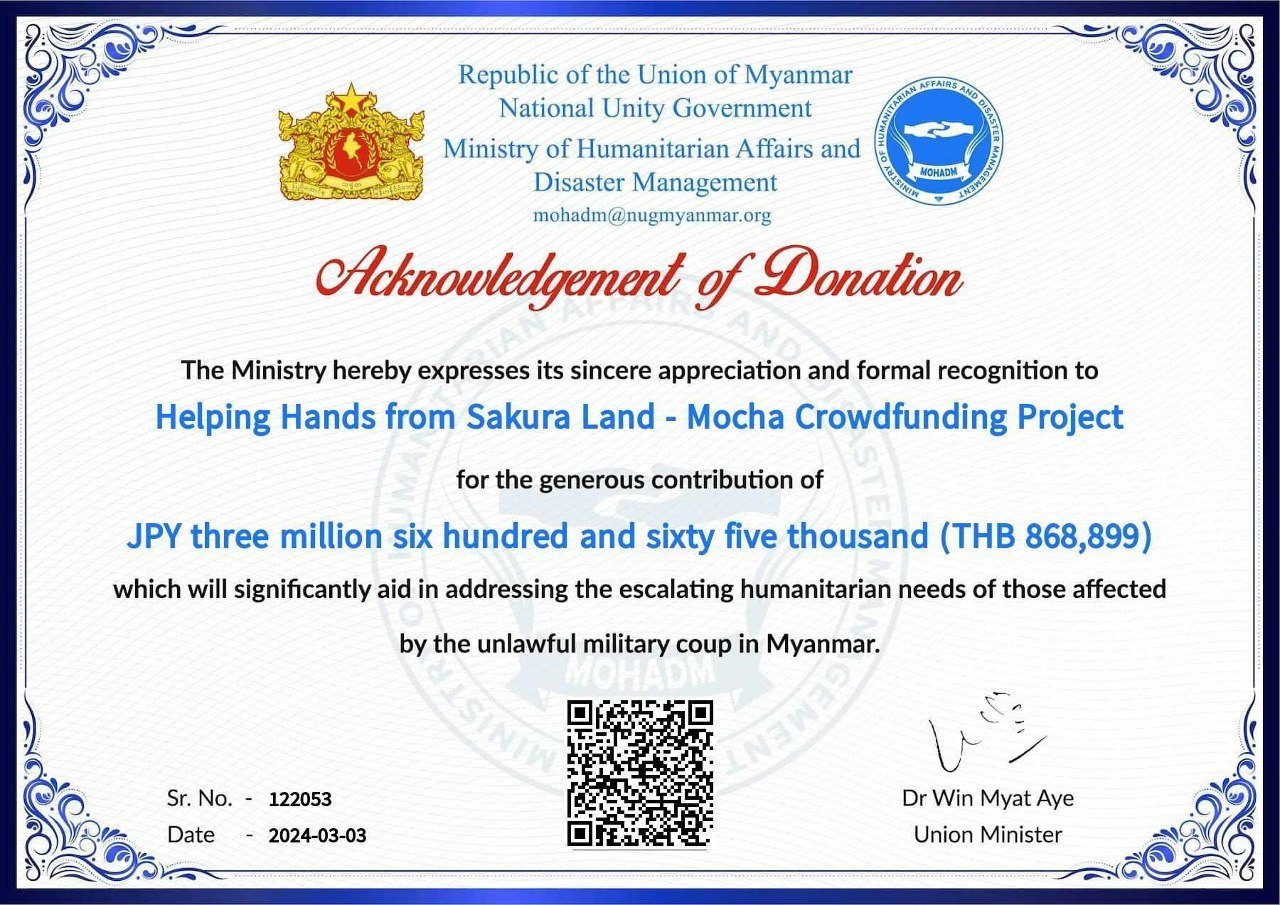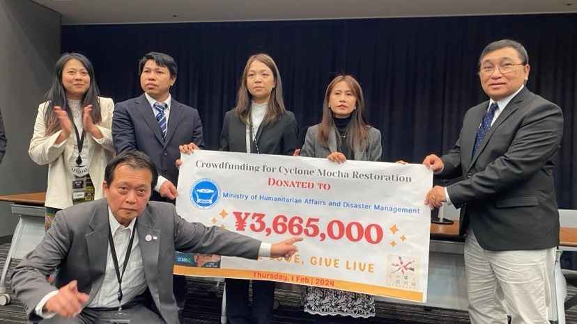 2024年2月1日に参議院議員会館1階「講堂」開催されたミャンマー軍事クーデターから3年院内集会で国民統一政府(NUG)人道問題・災害対策担当大臣であるウィンミャットエイ氏にクラウドファンディングの支援金を寄付しました。
