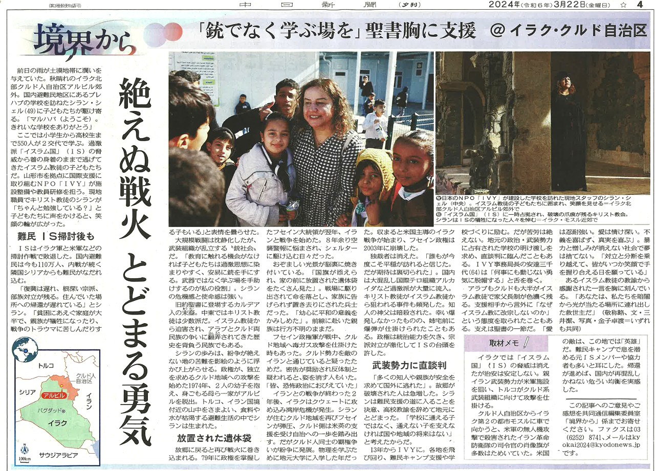 2024年3月22日の中日新聞夕刊に、IVYイラク事務所の現地職員シランさんを特集した記事が掲載されました。イラク北部のクルド人自治区でIVYが実施している教育支援の活動が取り上げられています。