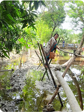 事業開始後、まず対象世帯調査を行ないました。例年であれば雨季が終わっているはずの10月に入っても降雨が続き、ひどいところでは腰の高さまで浸水している場所も。道路も冠水しているため、時には舟を出動させたり、地元の方が設置した丸太や竹の橋を渡ったりしながらの移動となり、調査活動は困難を極めました。