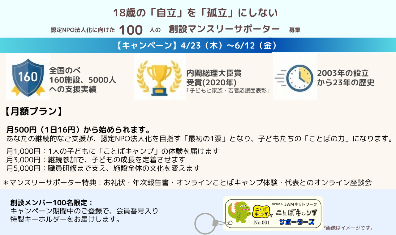 特定非営利活動法人JAMネットワークは、「"ことば力"で幸せを感じる社会へ」をビジョンに掲げ、2003年の創業以来、子どもたちのコミュニケーション能力育成に取り組んでいます。2008年から全国の児童養護施設・里親家庭に独自プログラム「ことばキャンプ®」を届け、17年以上の活動でのべ160施設・約5,000人の子どもと職員に関わり、2020年度に内閣総理大臣賞(「子どもと家族・若者応援団表彰」)を受賞しました。