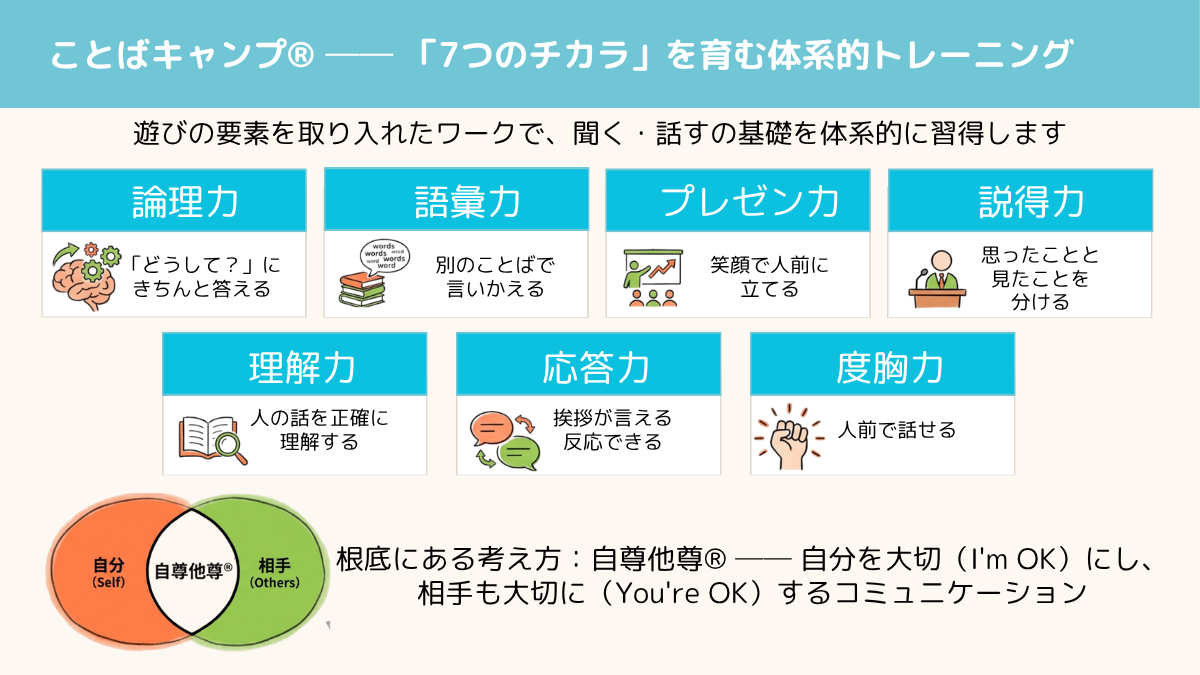 声を持てなかった子が、声を取り戻す。ことばの力は、社会で生き抜く武器です。その瞬間を、私たちは17年間見続けてきました。NPO法人JAMネットワークは、独自のプログラム「ことばキャンプ®」を通じて、子どもたちが自分の気持ちを言葉で伝える力を育てています。「どっちにする?」「気持ちを教えてくれてありがとう。」そんな小さなやりとりの積み重ねが、自己肯定感につながります。