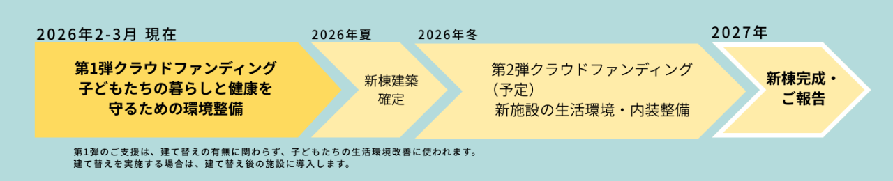 ※建て替えをこのスケジュール通りに実施しない場合でも、皆様からのご支援は、Dream Trainの生活環境を改善するため、現状の施設に設置するインフラ設備のために使用します。