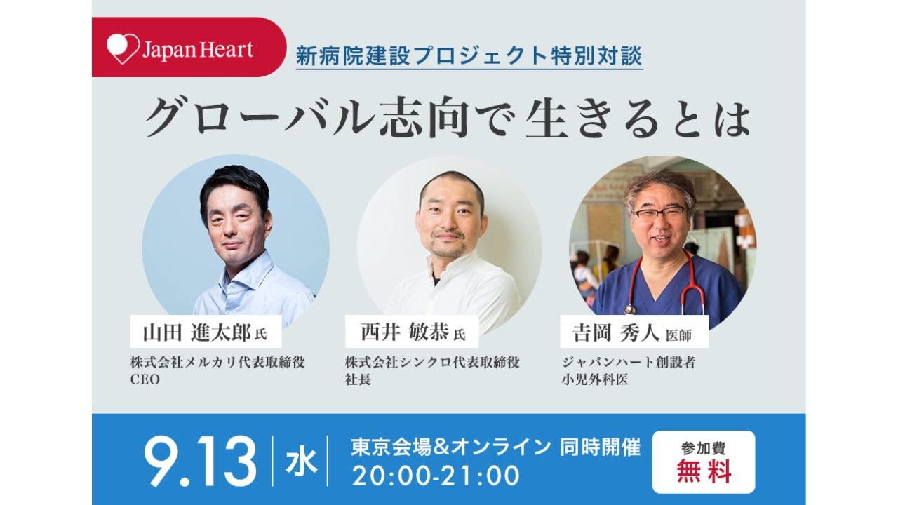 9月30日までのクラウドファンディング特別企画として、ジャパンハート創設者吉岡と理事の西井敏恭氏に加え、アドバイザリーボードである山田進太郎氏をお迎えして、トークセッションを開催することとなりました。