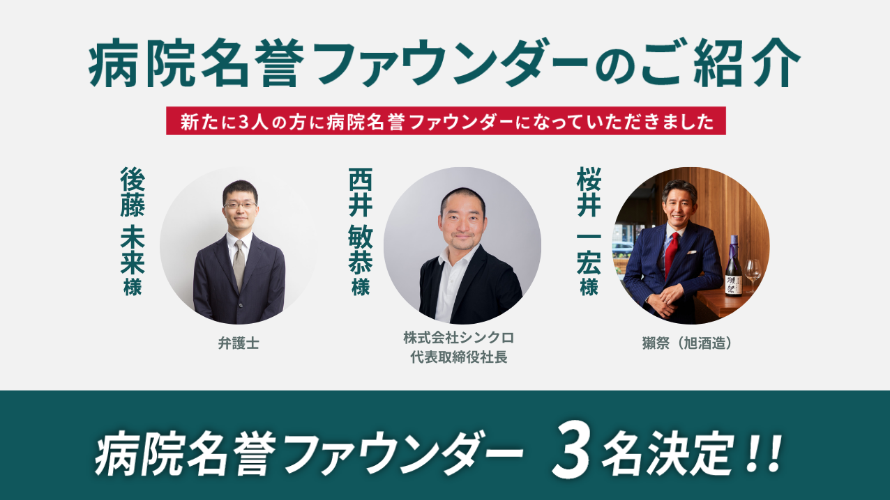 すでに多くの方にお申し込みをいただいていますが、今回は新たに病院名誉ファウンダーに就任いただいた以下の3名の方をご紹介します。