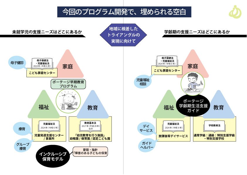 本プロジェクトは、就学までの個別支援のみならず、保育園・幼稚園といった集団の中でのより良い発達に対するインクルージョン保育や学齢期以降の発達支援プログラムを開発し、セミナーや学習会などを通じて普及活動を行う取組となります。