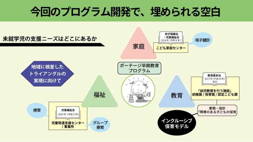 2025-12-16 17:00子ども中心の、地域と人生を「つなぐ保育」として誰も取り残さない支援プログラムの開発① 幼児教育施設のためのプログラム 現在わが国では、子どもたちは出生後から地域母子保健で健診を受け、相談支援を受けています。保健指導から児童発達支援事業等の福祉へ移行した段階で、本人支援(個別療育・集団療育)、家族支援、地域支援が開始されます。その後、就学後は、学校教育と放課後等デイサービスの福祉が大きな役割を果たしています。 そのちょうど中間の段階、児童発達支援から就学までの間の、保育所・認定こども園・幼稚園での「配慮の必要な子どもの保育」のためのモデル開発が、本プロジェクトのテーマとなっています。2025-12-16 17:00子ども中心の、地域と人生を「つなぐ保育」として誰も取り残さない支援プログラムの開発① 幼児教育施設のためのプログラム 現在わが国では、子どもたちは出生後から地域母子保健で健診を受け、相談支援を受けています。保健指導から児童発達支援事業等の福祉へ移行した段階で、本人支援(個別療育・集団療育)、家族支援、地域支援が開始されます。その後、就学後は、学校教育と放課後等デイサービスの福祉が大きな役割を果たしています。 そのちょうど中間の段階、児童発達支援から就学までの間の、保育所・認定こども園・幼稚園での「配慮の必要な子どもの保育」のためのモデル開発が、本プロジェクトのテーマとなっています。