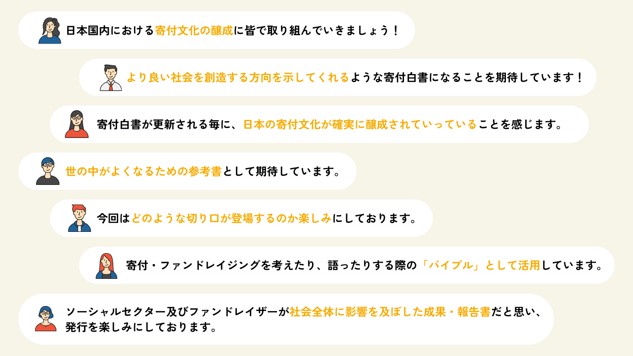 寄付白書2025に寄せられた皆様からの期待や応援のメッセージをご紹介いたします。